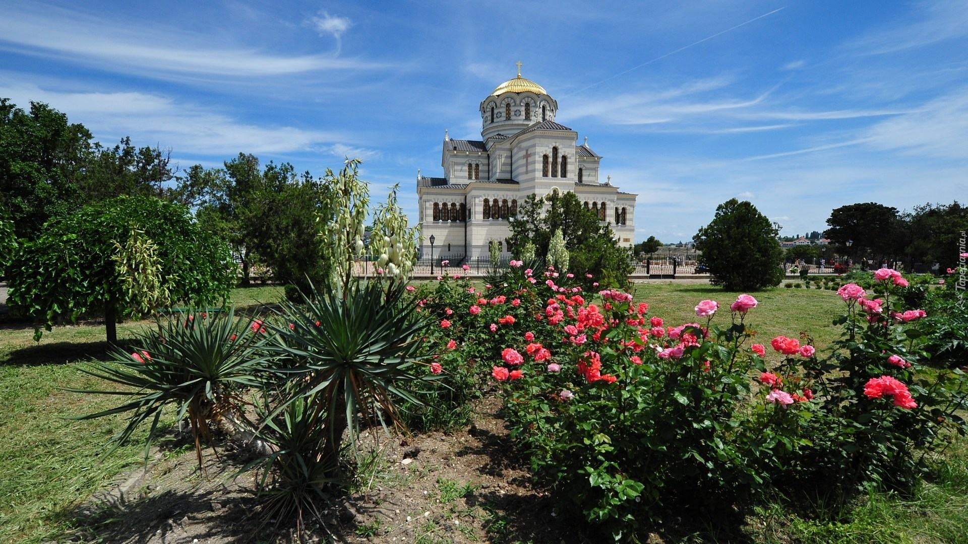 Edytor tapety: Ukraina, Cerkiew, Ogród, Kwiaty, Drzewa, Krzewy
