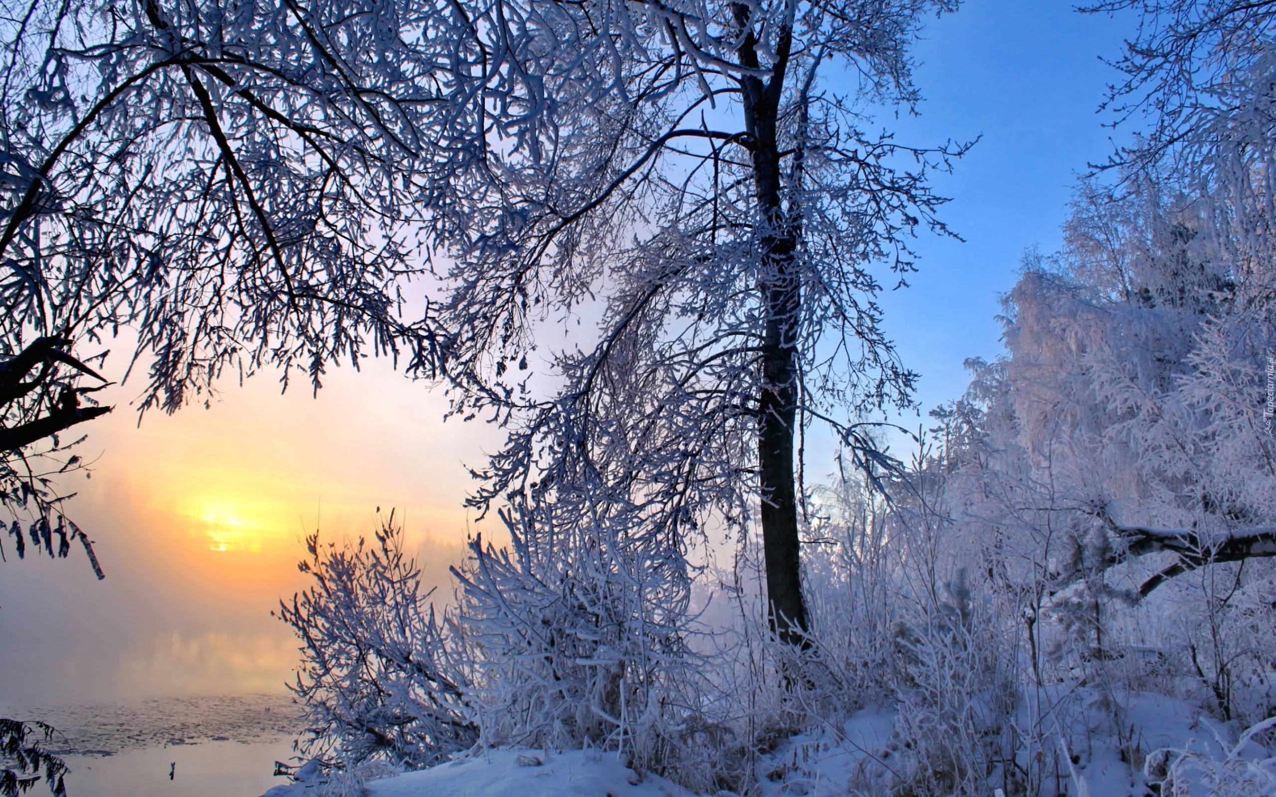 Edytor tapety: Rzeka, Mgła, Drzewa, Wschód, Słońca, Zima