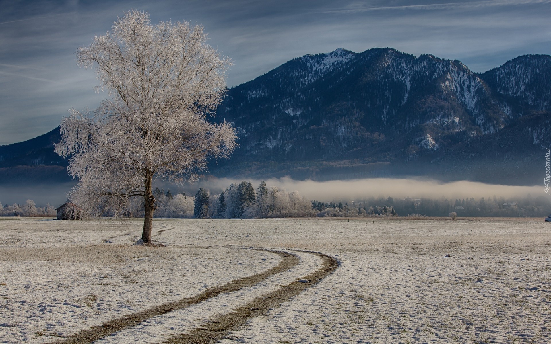 Edytor tapety: Pola, Droga, Góry, Lasy, Mgła, Zima