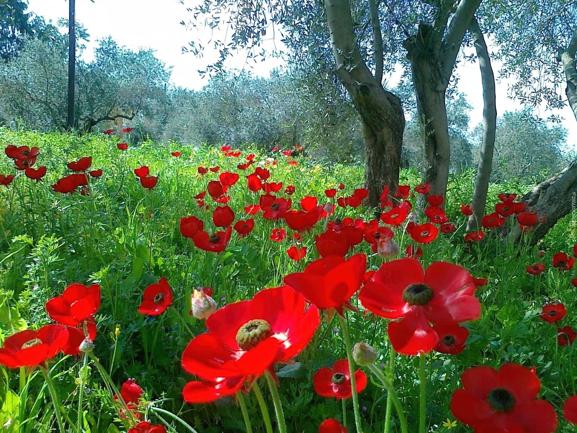 Edytor tapety: Łąka, Maki, Drzewa