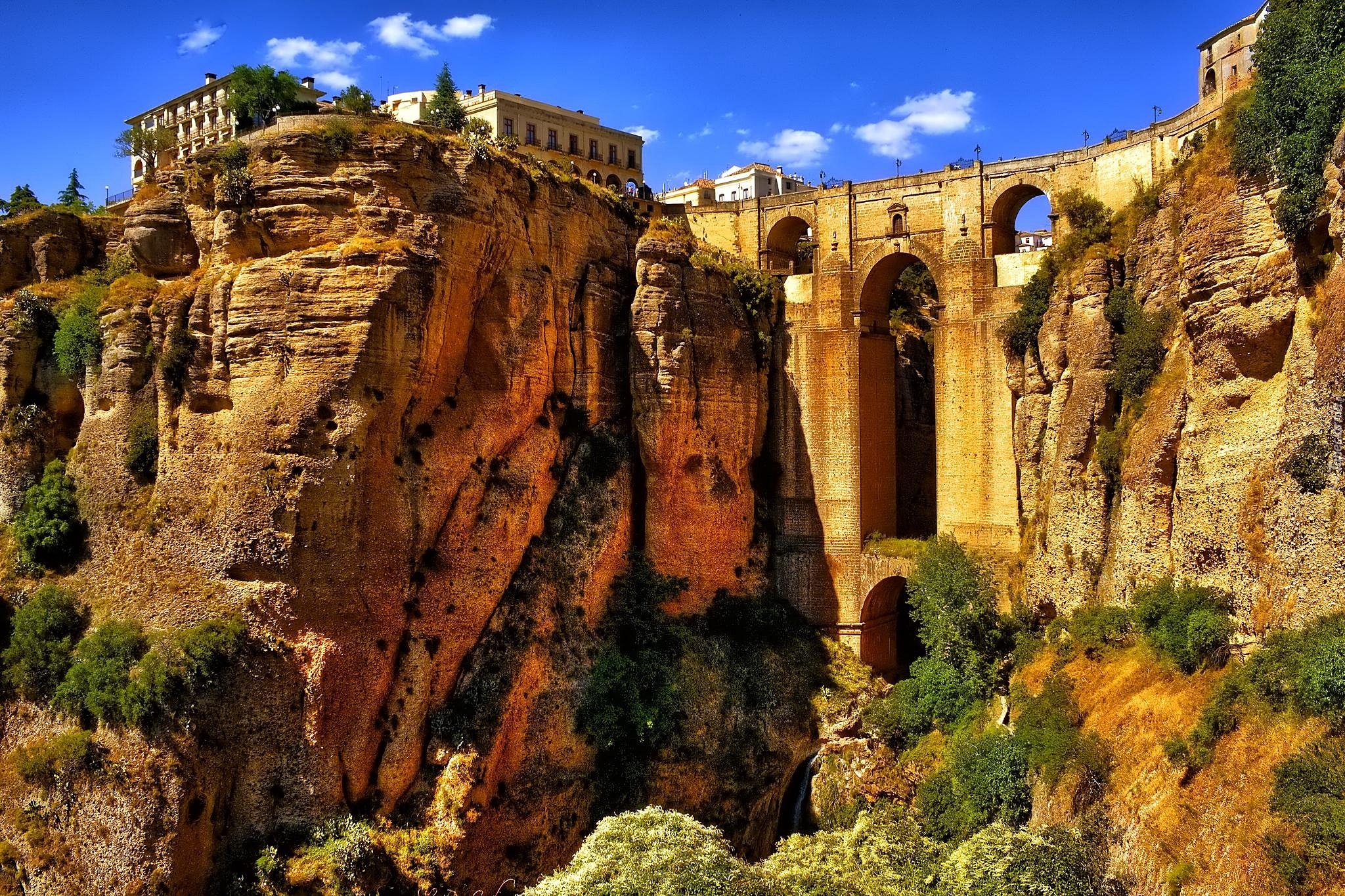 Edytor tapety: Wąwóz Tajo, Skały, Most Puente Nuevo, Domy, Miasto Ronda, Andaluzja, Hiszpania