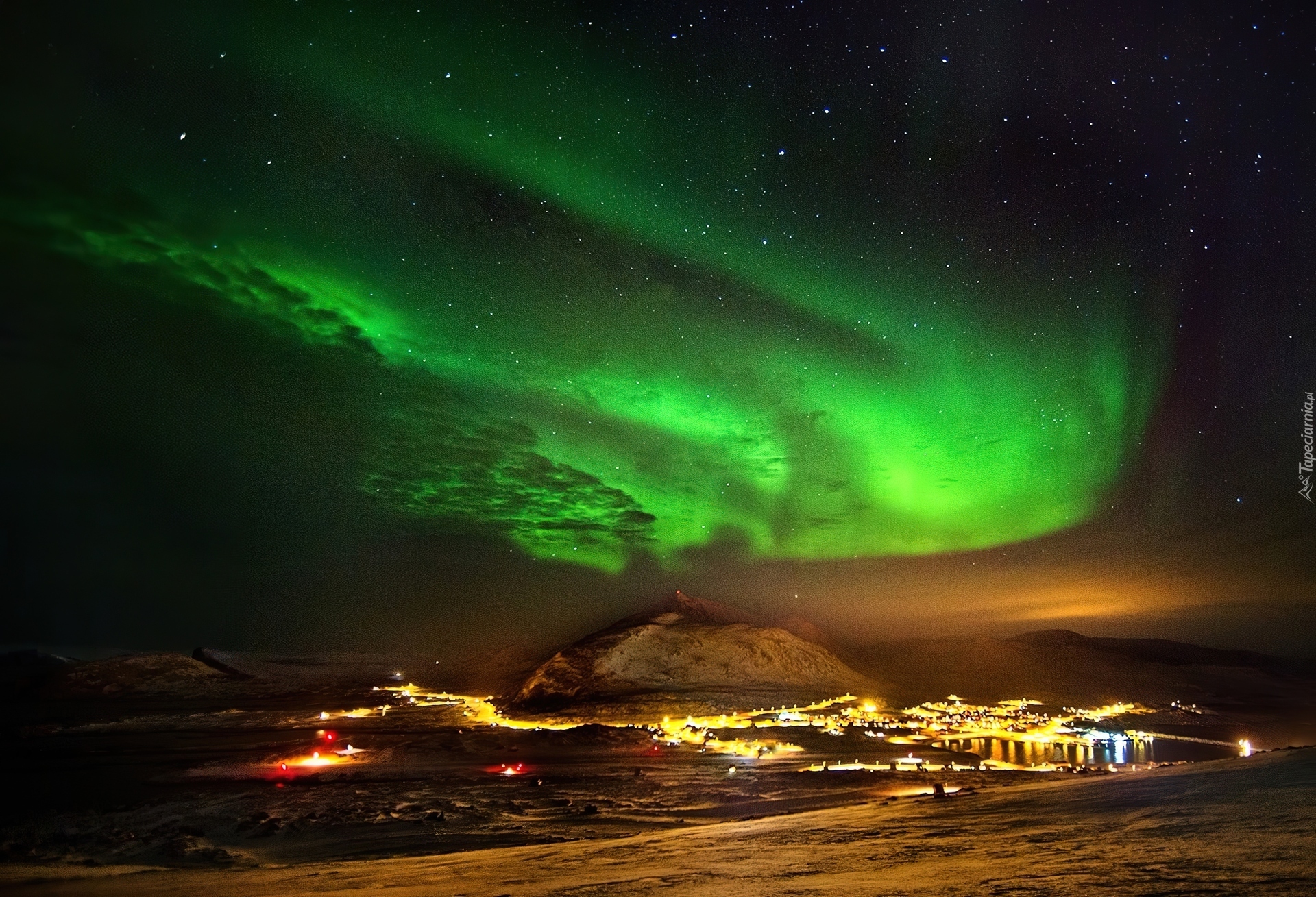 Edytor tapety: Zorza, Polarna, Miasteczko, Góry