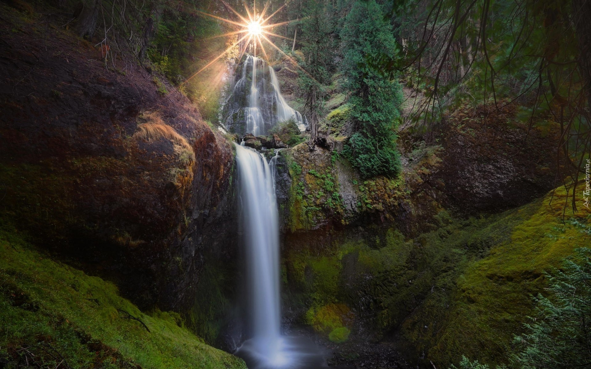 Edytor tapety: Wodospad, Skały, Las, Promienie, Słońca