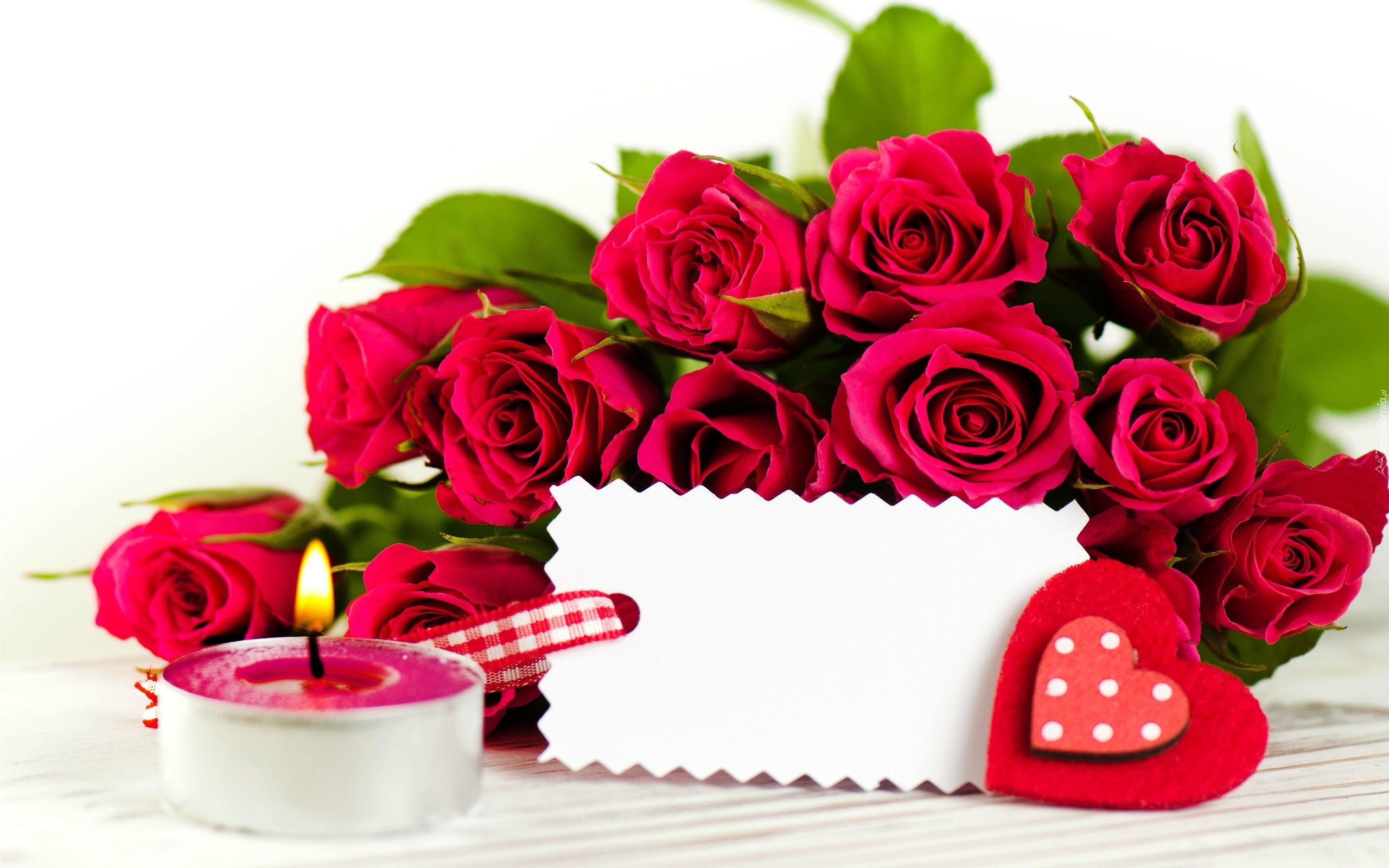 Edytor tapety: Bukiet, Czerwone, Róże, Serduszka, Świeca, Walentynki, Kartka