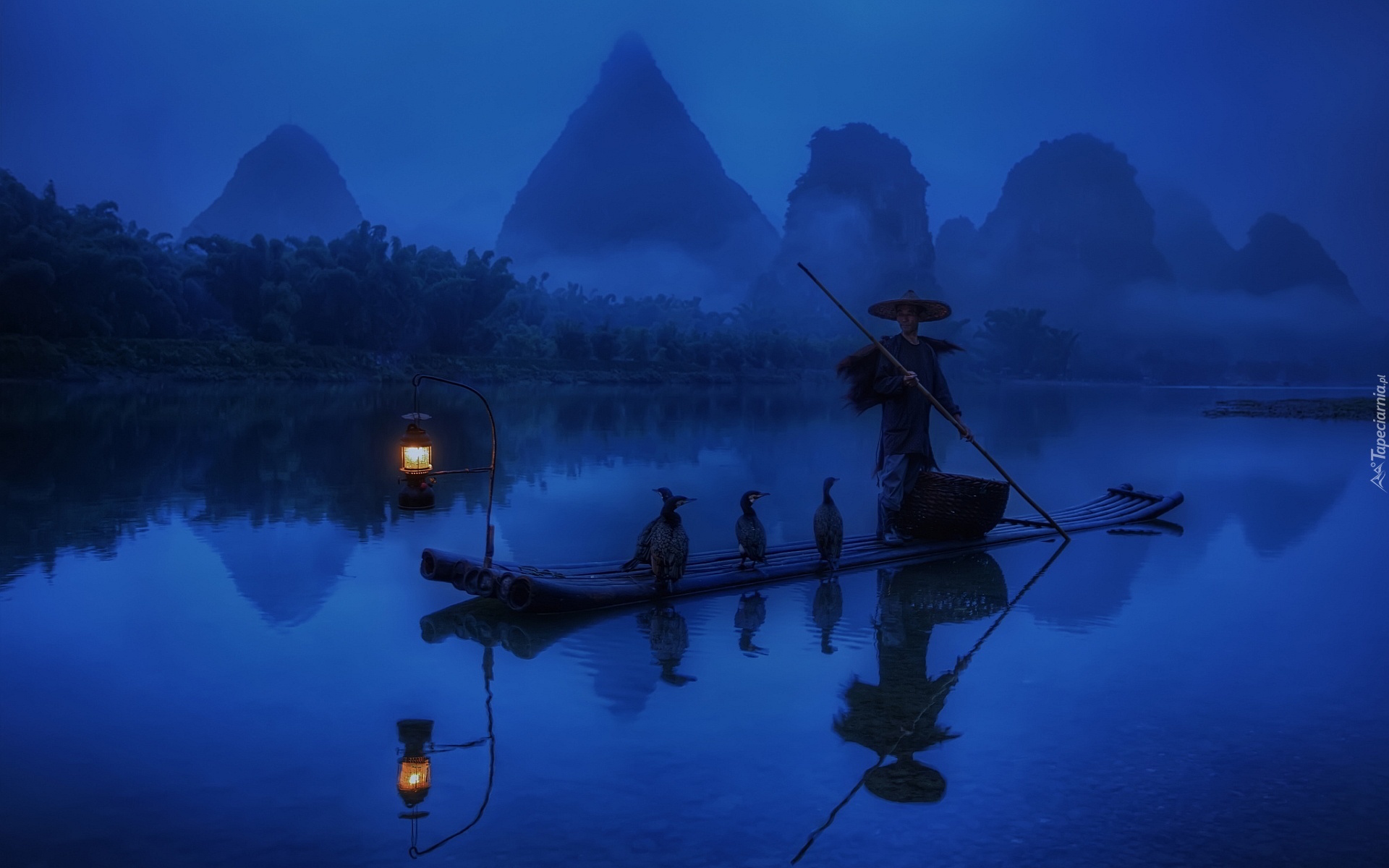 Edytor tapety: Rzeka, Kormorany, Człowiek, Noc, Łódka