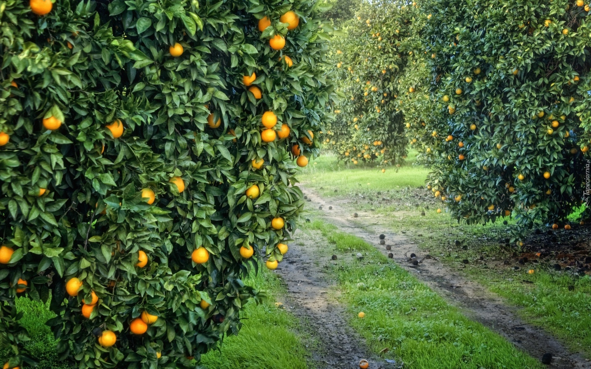 Edytor tapety: Sad, Drzewa, Pomarańcze, Ścieżka, Trawa