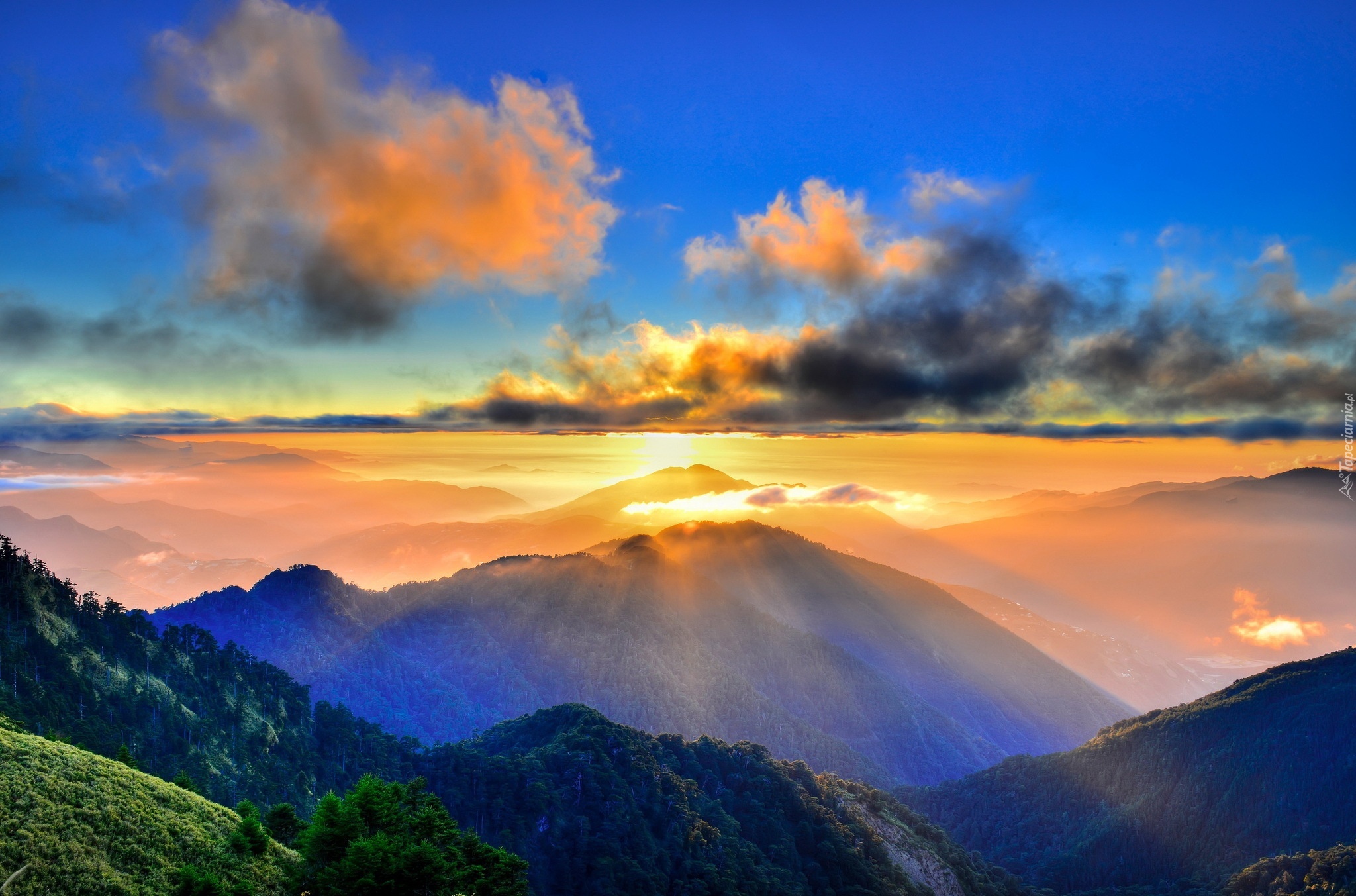 Edytor tapety: Góry, Chmury, Promienie, Słoneczne
