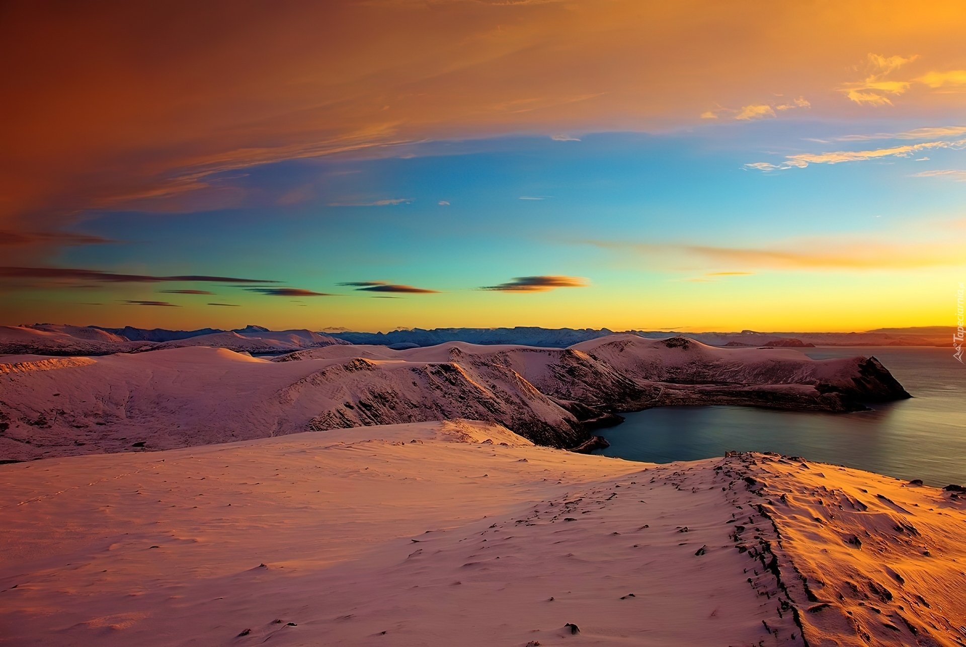 Edytor tapety: Zachód, Słońca, Morze, Śnieg, Skały