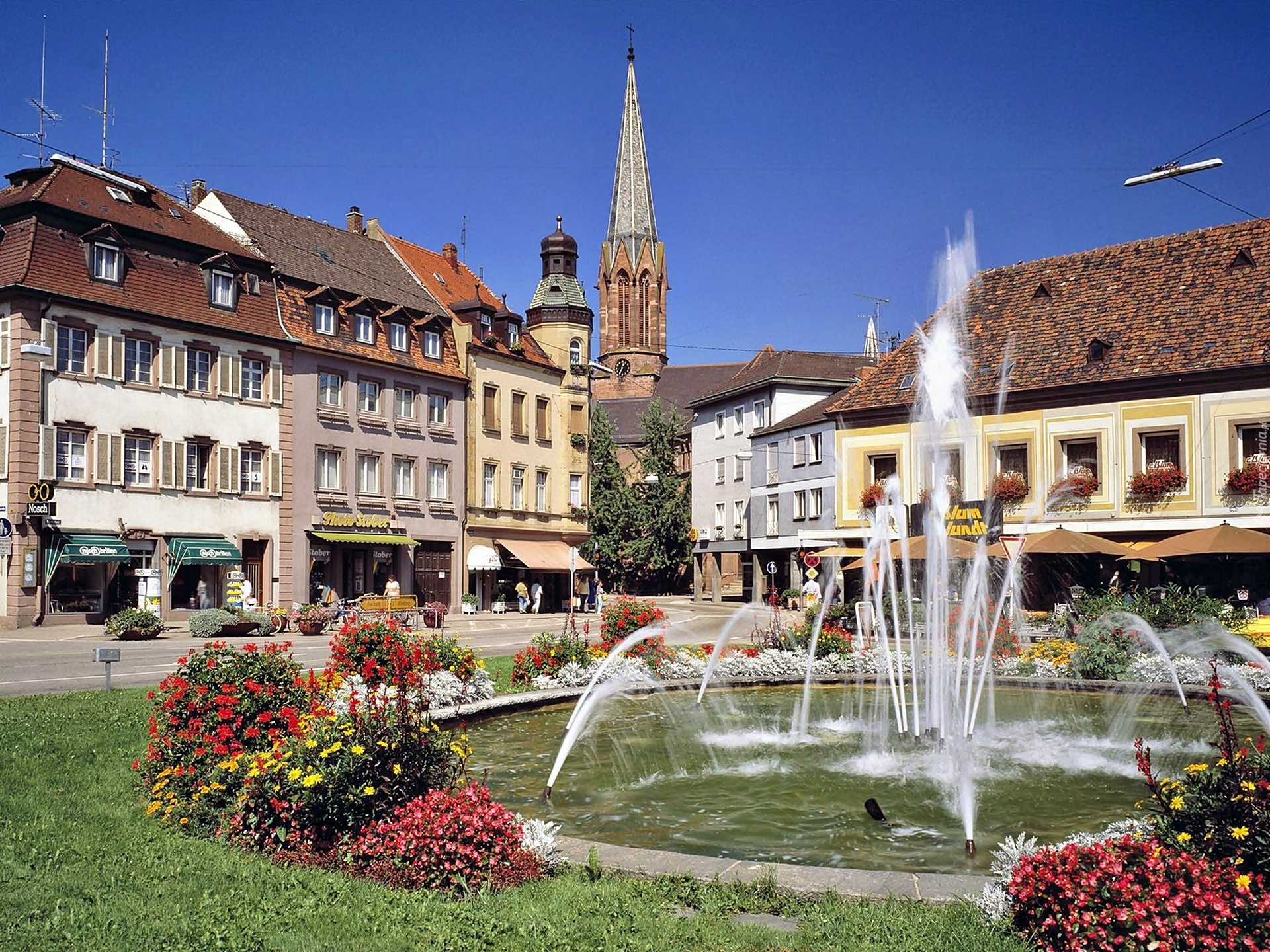 Edytor tapety: Kolorowe, Kamieniczki, Kościół, Rynek, Fontanna