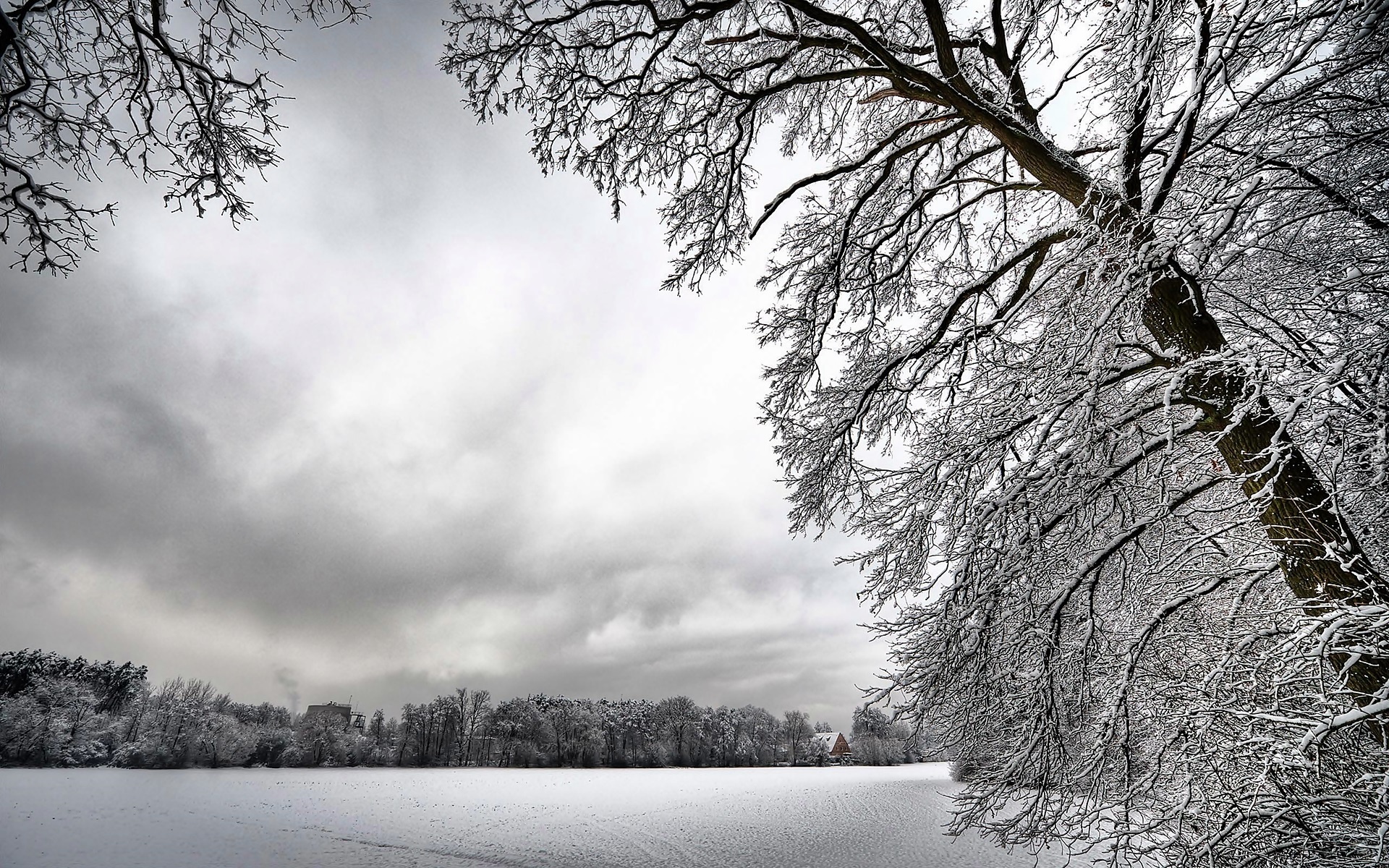 Edytor tapety: Domy, Zamarznięta, Rzeka, Drzewa Zima