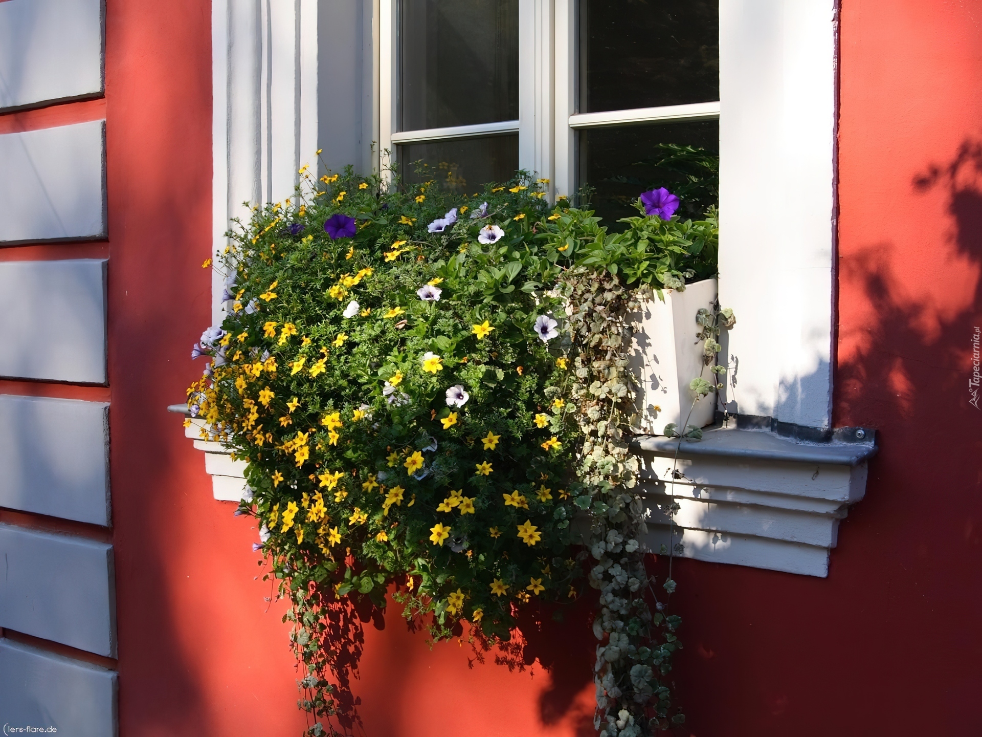 Edytor tapety: Dom, Okno, Kwiaty, Skrzynka