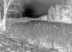 Edytor tapety: Rzeka, Trawy, Drzewa, Zachód, Słońca, Zima