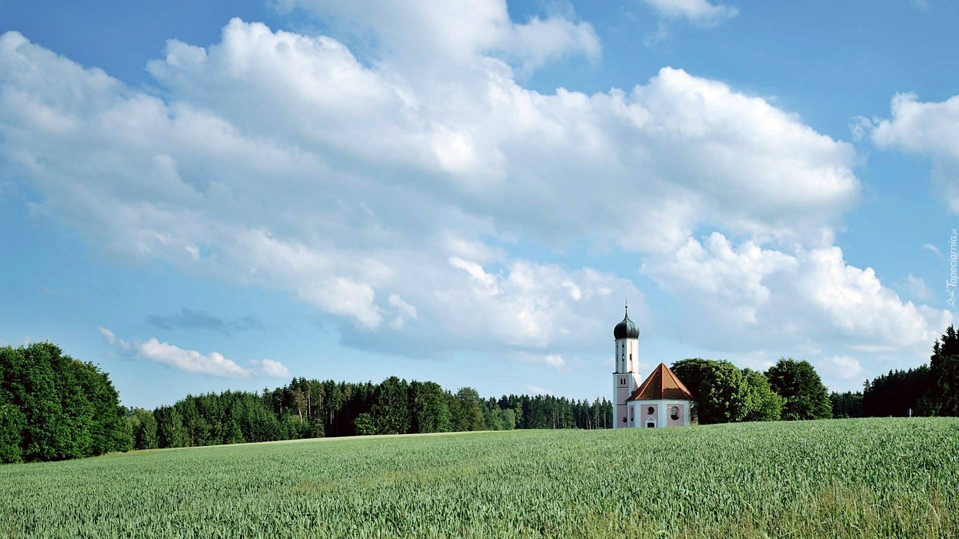 Edytor tapety: Obłoki, Las, Pole, Kościół