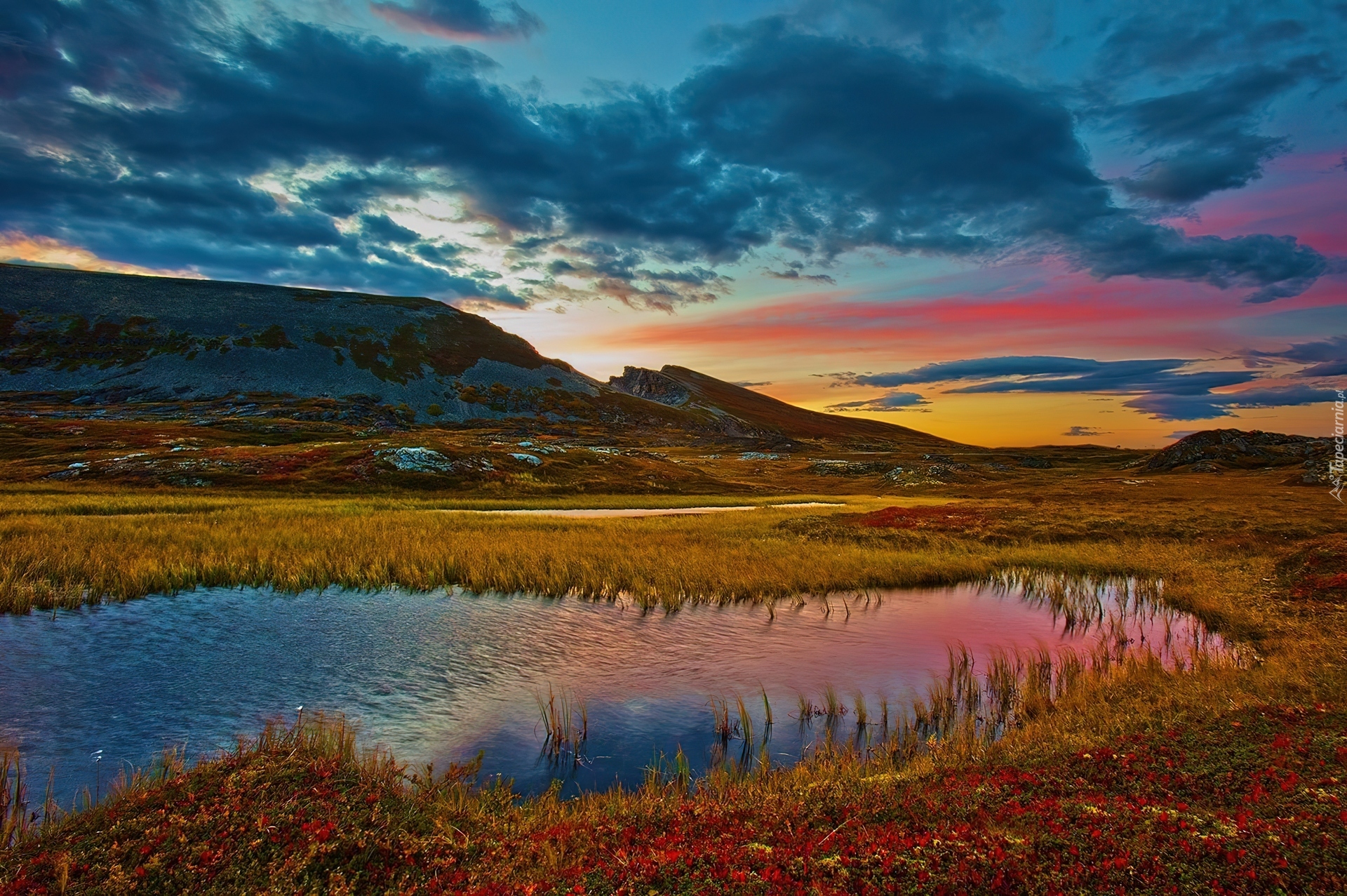 Edytor tapety: Zachód, Słońca, Góry, Rozlewiska