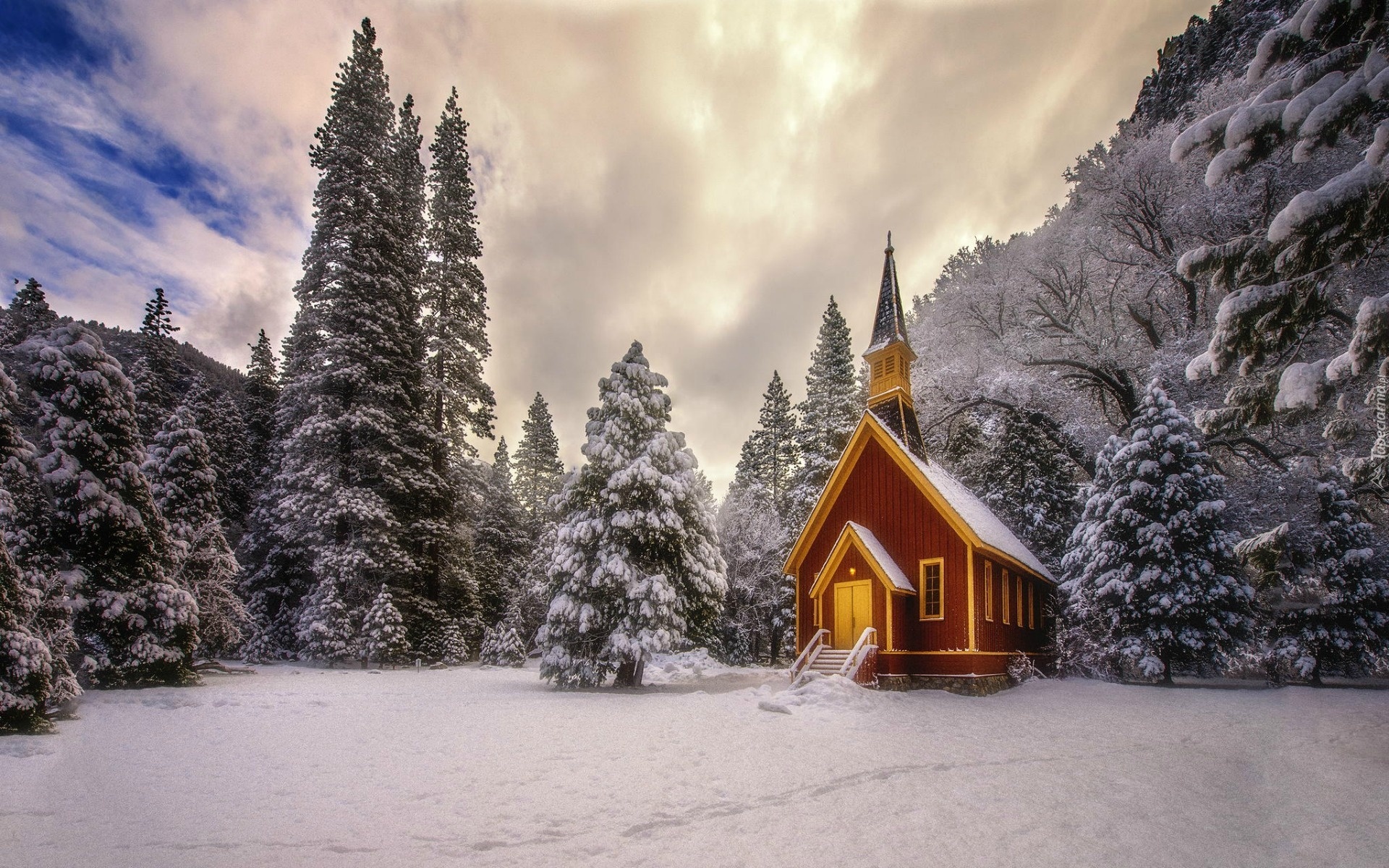 Edytor tapety: Zima, Świerki, Drzewa, Kaplica, Kościółek, Las, Park Narodowy Yosemite, Stan Kalifornia, Stany Zjednoczone