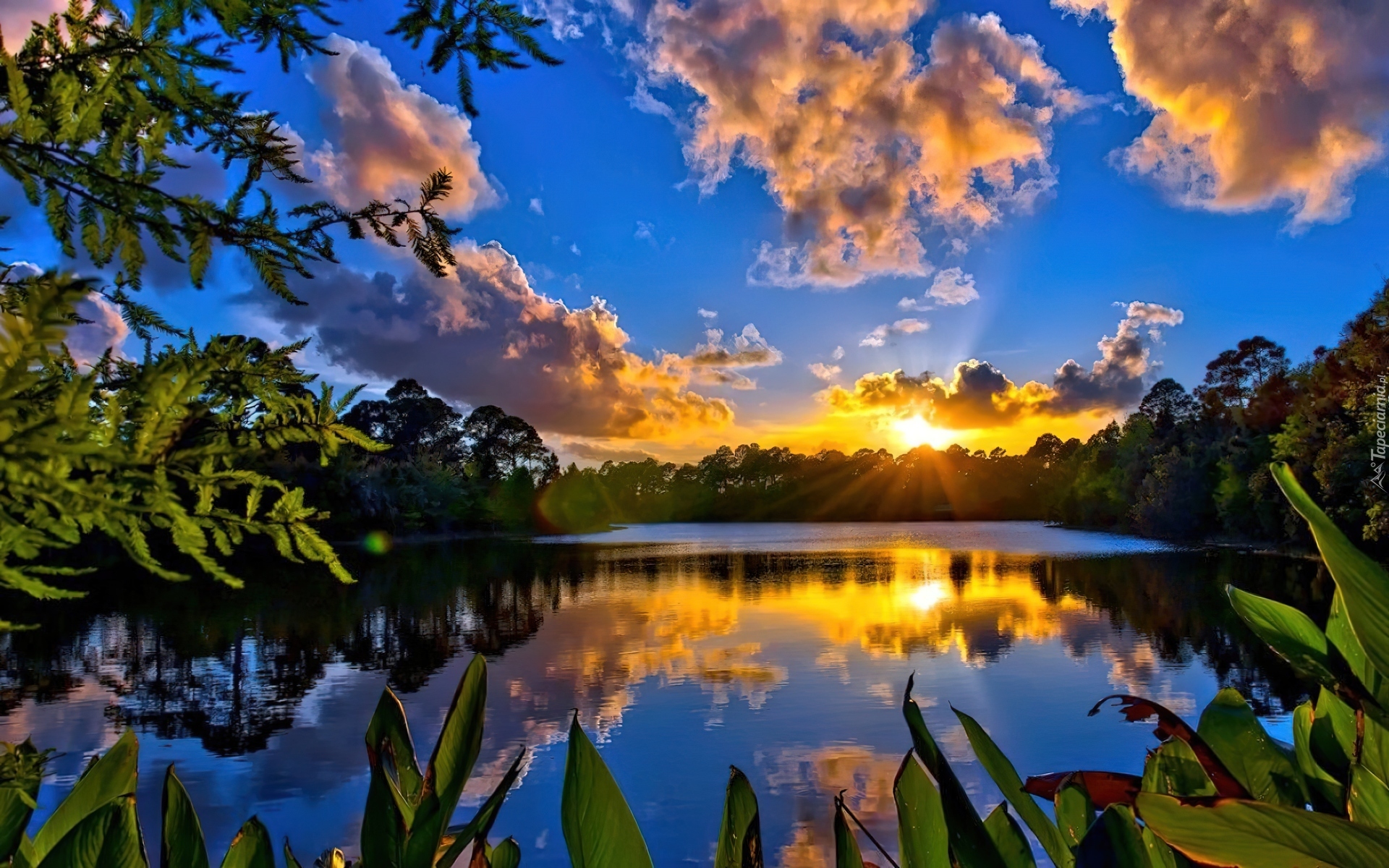 Edytor tapety: Jezioro, Zachód, Słońca, Rośliny, Drzewa