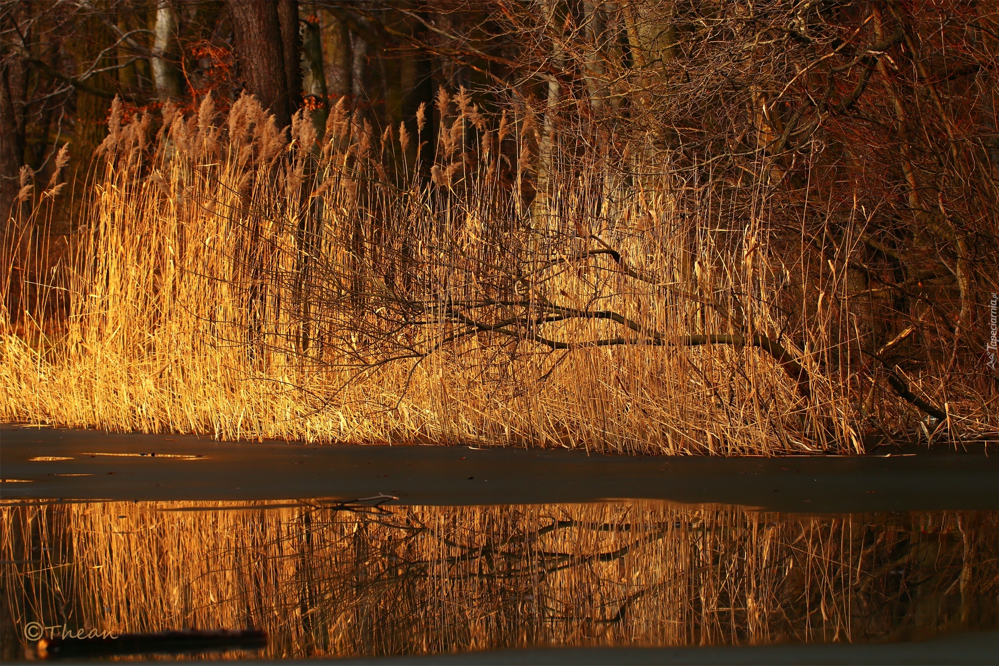 Edytor tapety: Jezioro, Topniejące, Trawy, Drzewa, Przedwiośnie