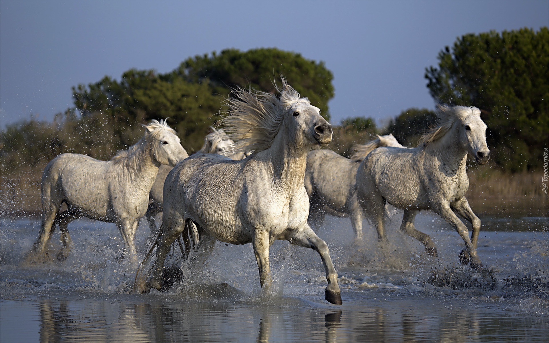 Edytor tapety: Rzeka, Konie, Drzewa
