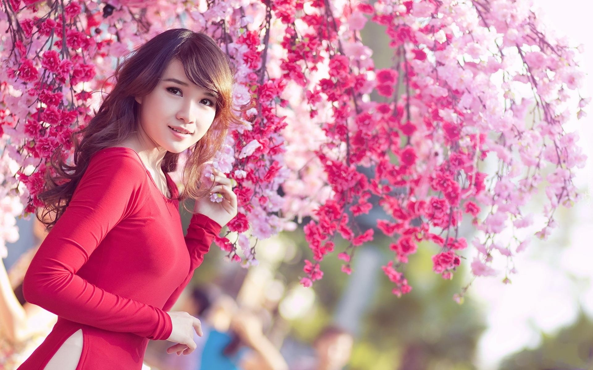Edytor tapety: Uśmiechnięta, Japoneczka, Kwitnące, Drzewo, Ogród