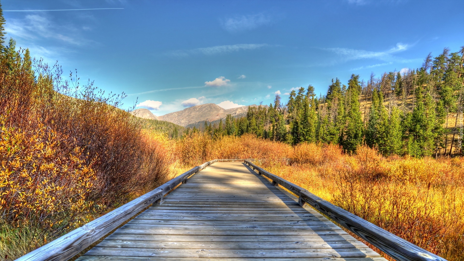 Edytor tapety: Mostek, Drzewa, Trawa, Góry