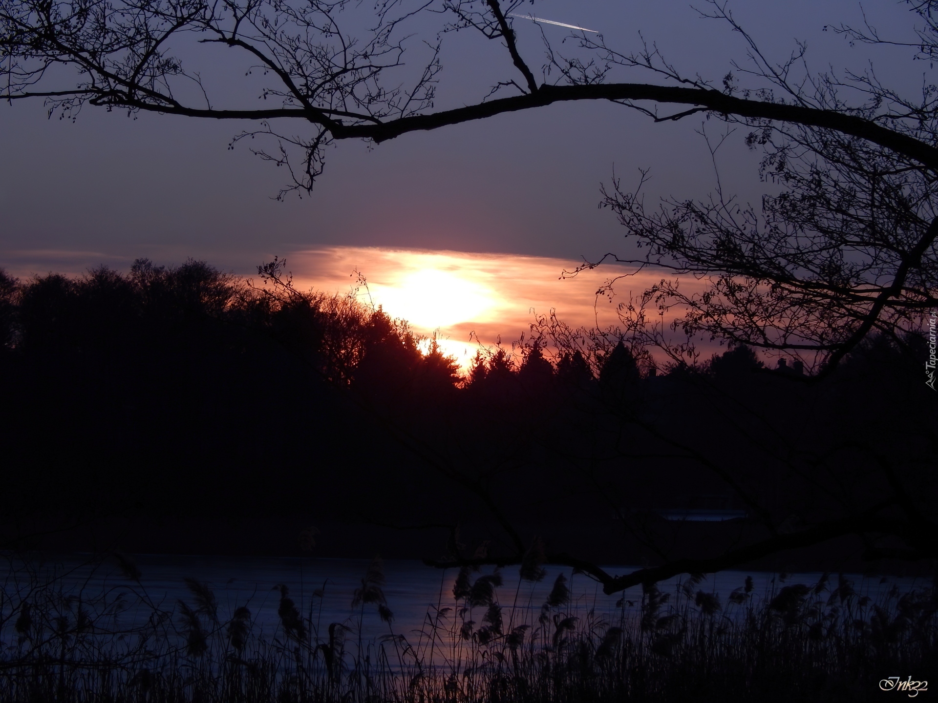 Edytor tapety: Zachód, Słońca, Drzewa, Gałęzie, Trzcina