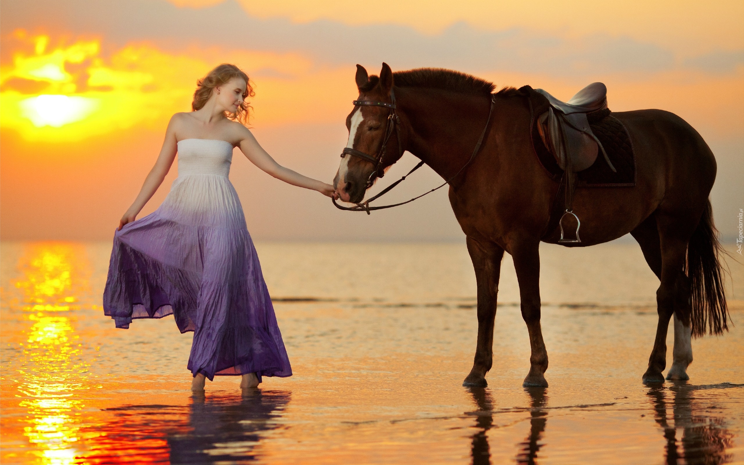 Edytor tapety: Kobieta, Sukienka, Koń, Morze, Zachód, Słońca