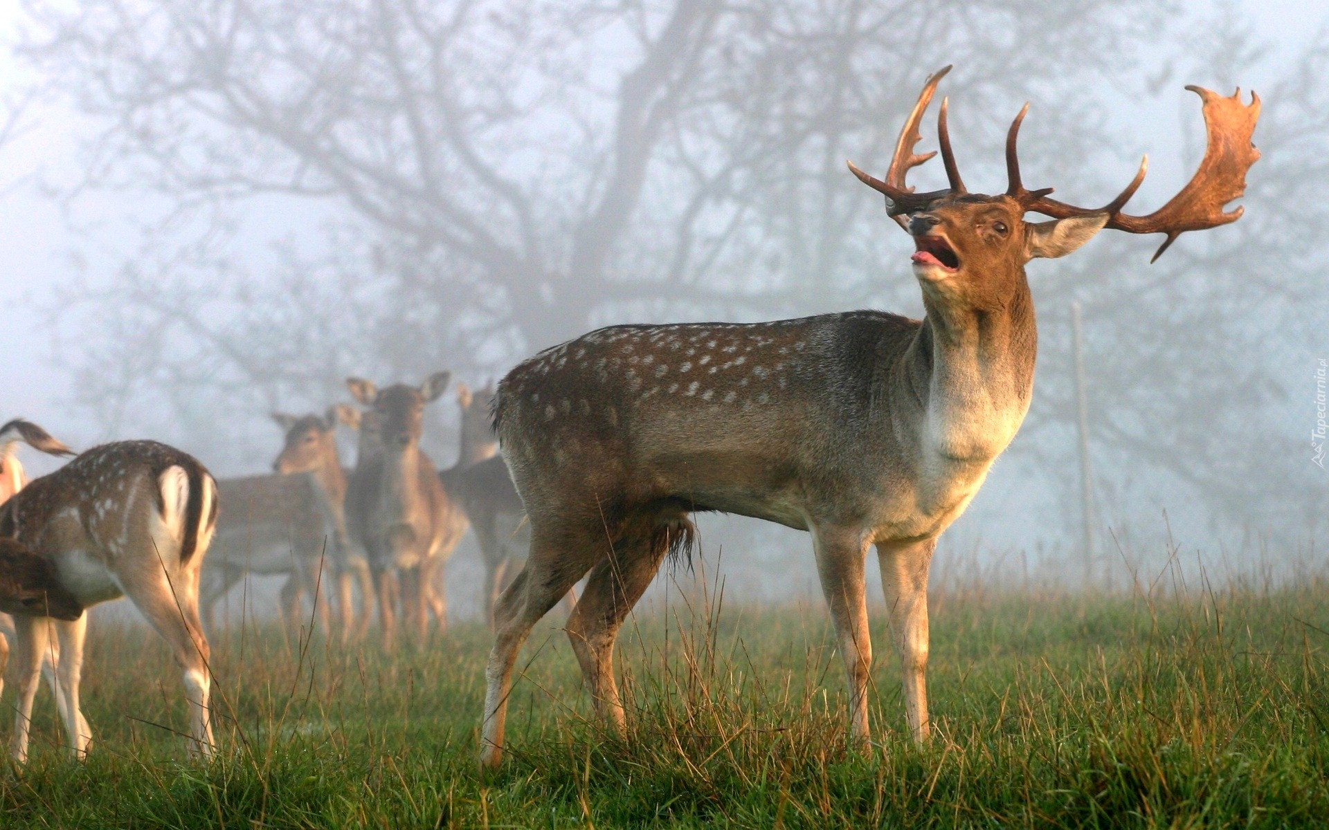 Edytor tapety: Jelenie, Łąka, Mgła