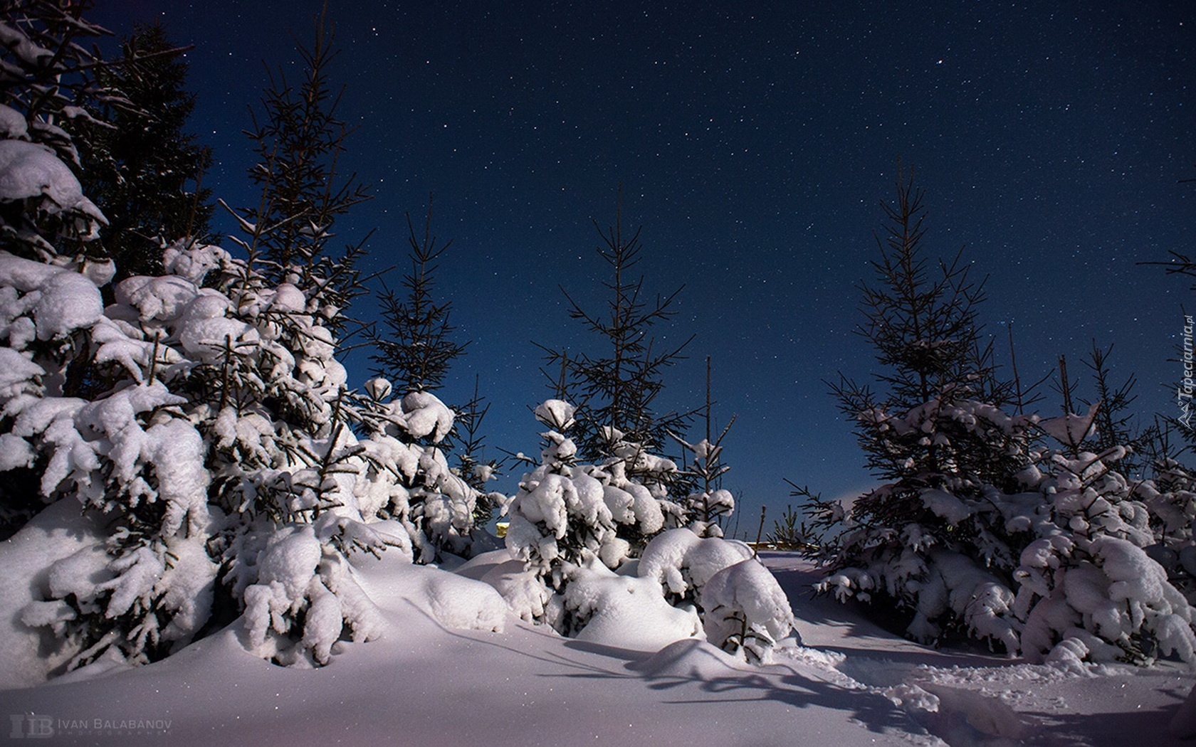 Edytor tapety: Zima, Ośnieżone, Drzewa, Noc, Gwiazdy