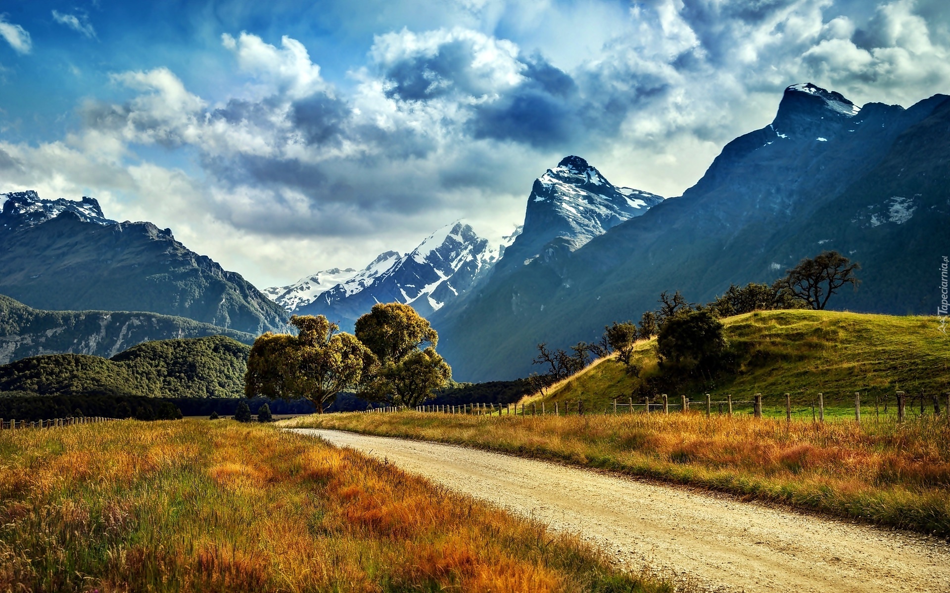 Edytor tapety: Szczyty, Górskie, Las, Łąki, Droga
