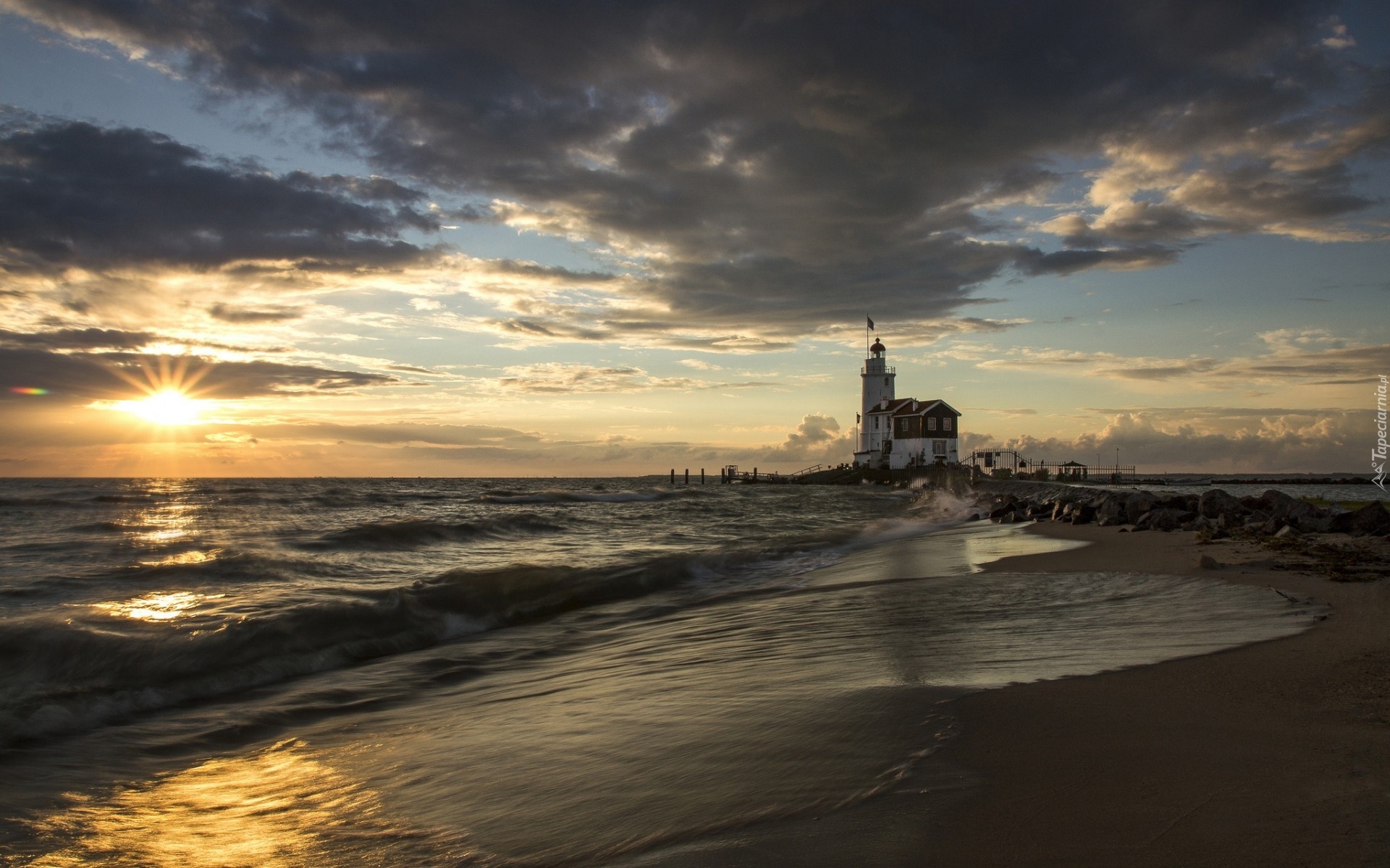 Edytor tapety: Latarnia, Morska, Wybrzeże, Fale, Chmury, Promienie, Słońca