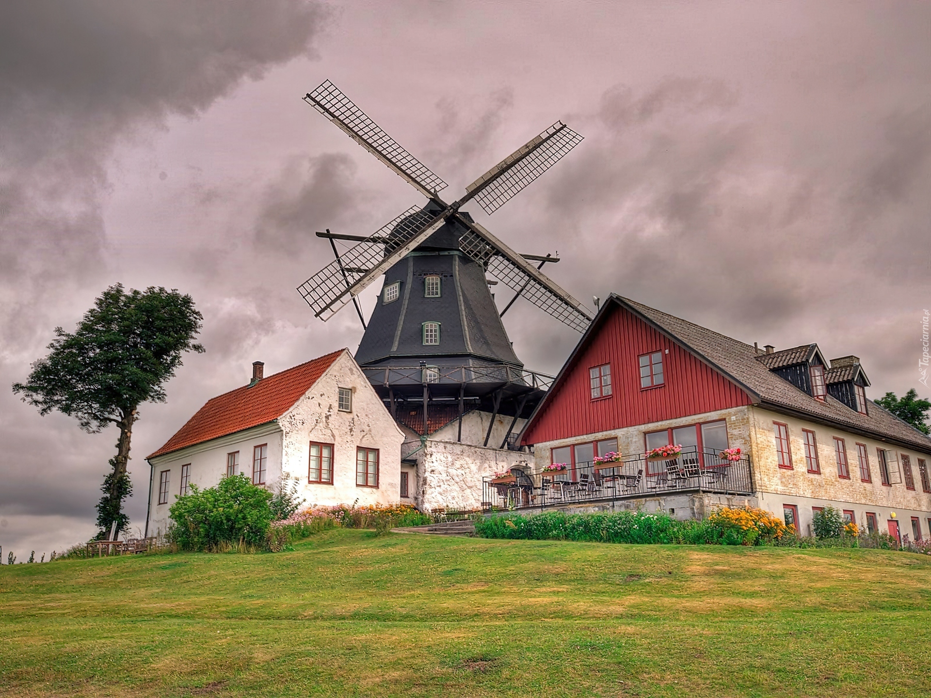 Edytor tapety: Wiatrak, Domy, Ogródek, Łąka