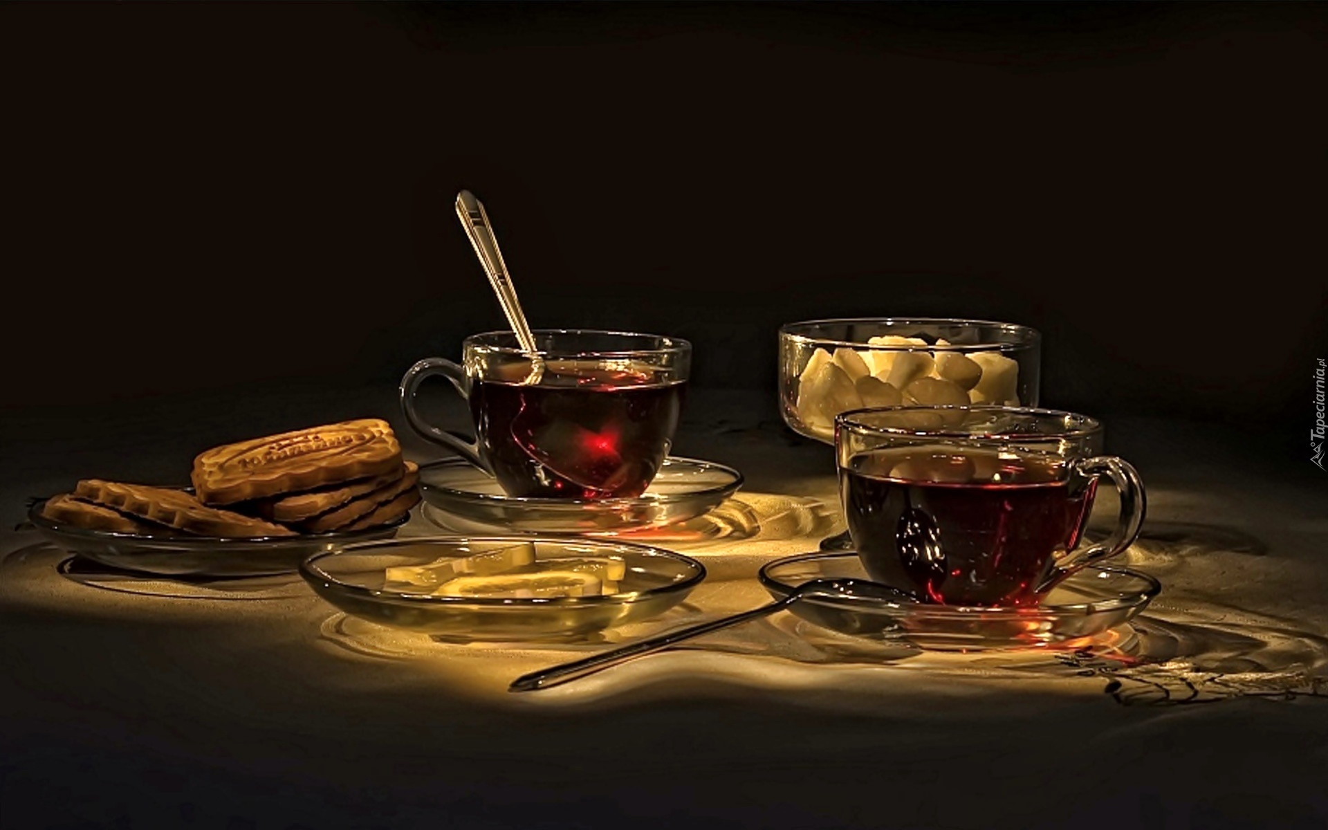 Edytor tapety: Filiżanki, Herbata, Ciasteczka, Cytryna, Cukier