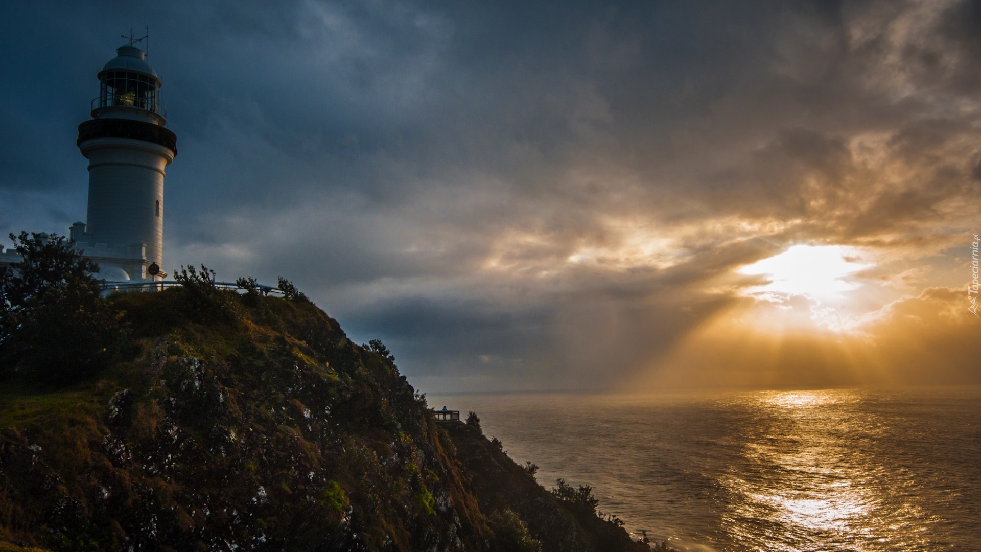 Edytor tapety: Latarnia, Morska, Wybrzeże, Chmury, Promienie, Słońca