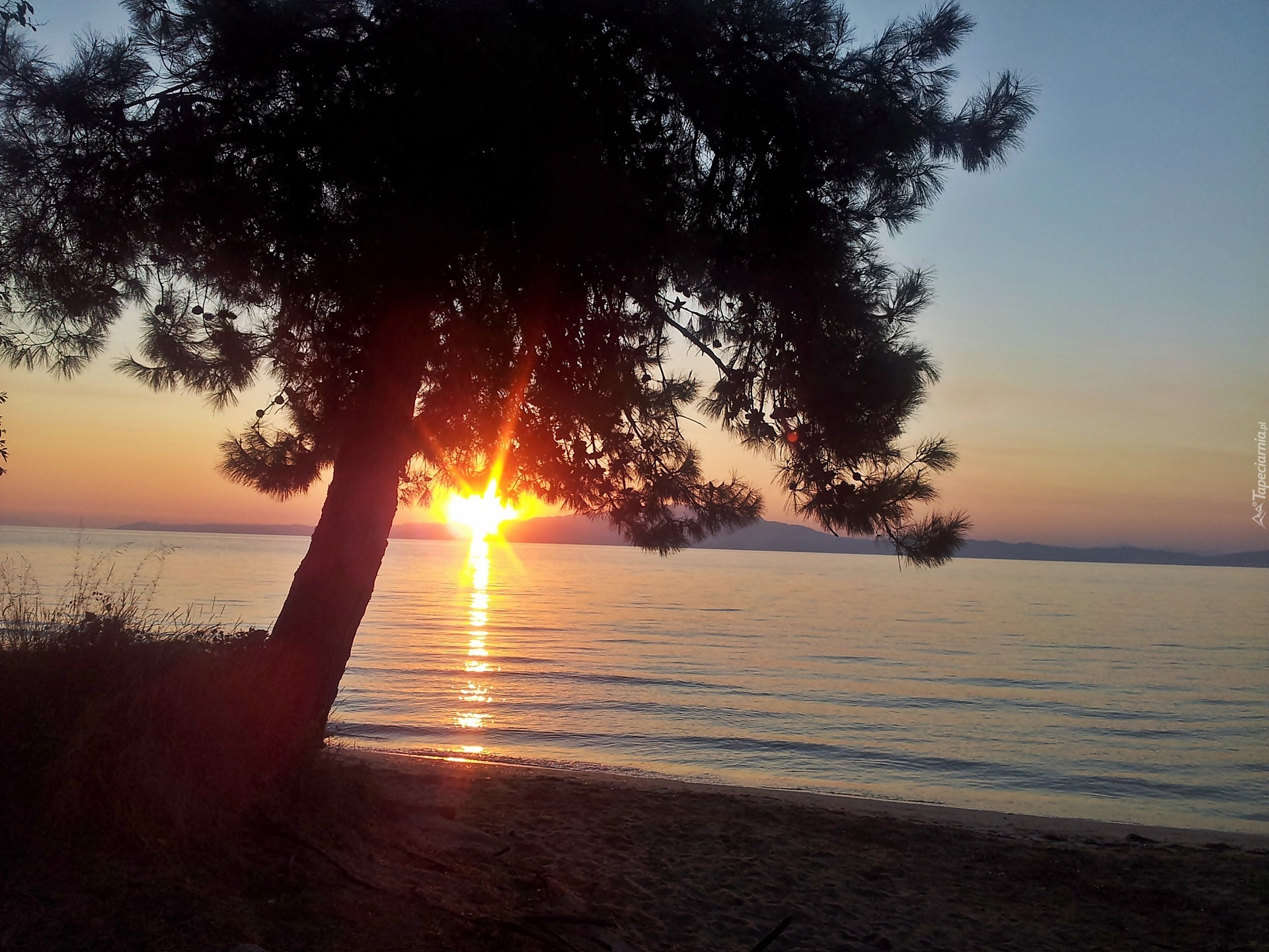 Edytor tapety: Jezioro, Sosna, zachód, Słońca