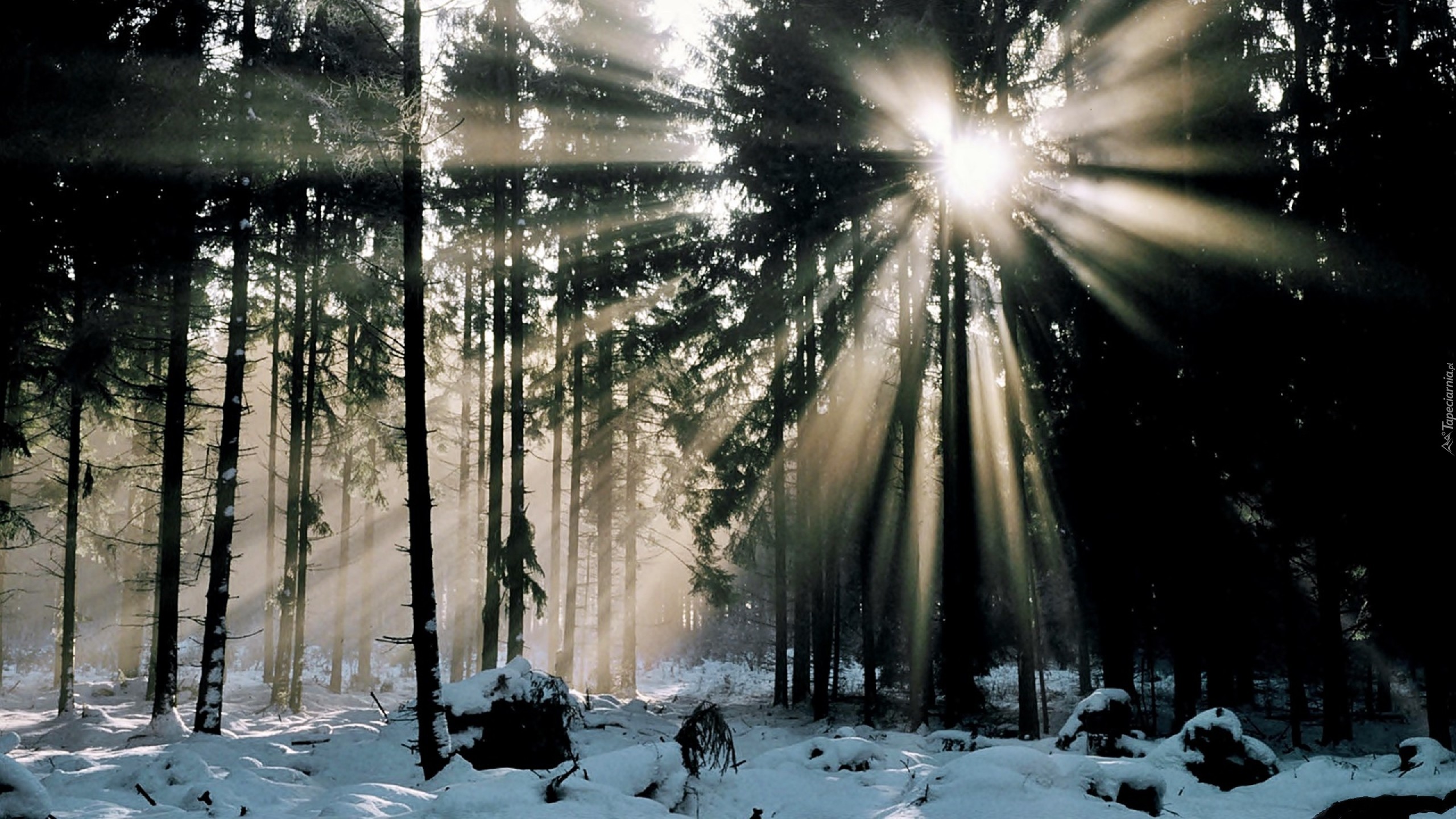 Edytor tapety: Las, Śnieg, Promienie, Słońca