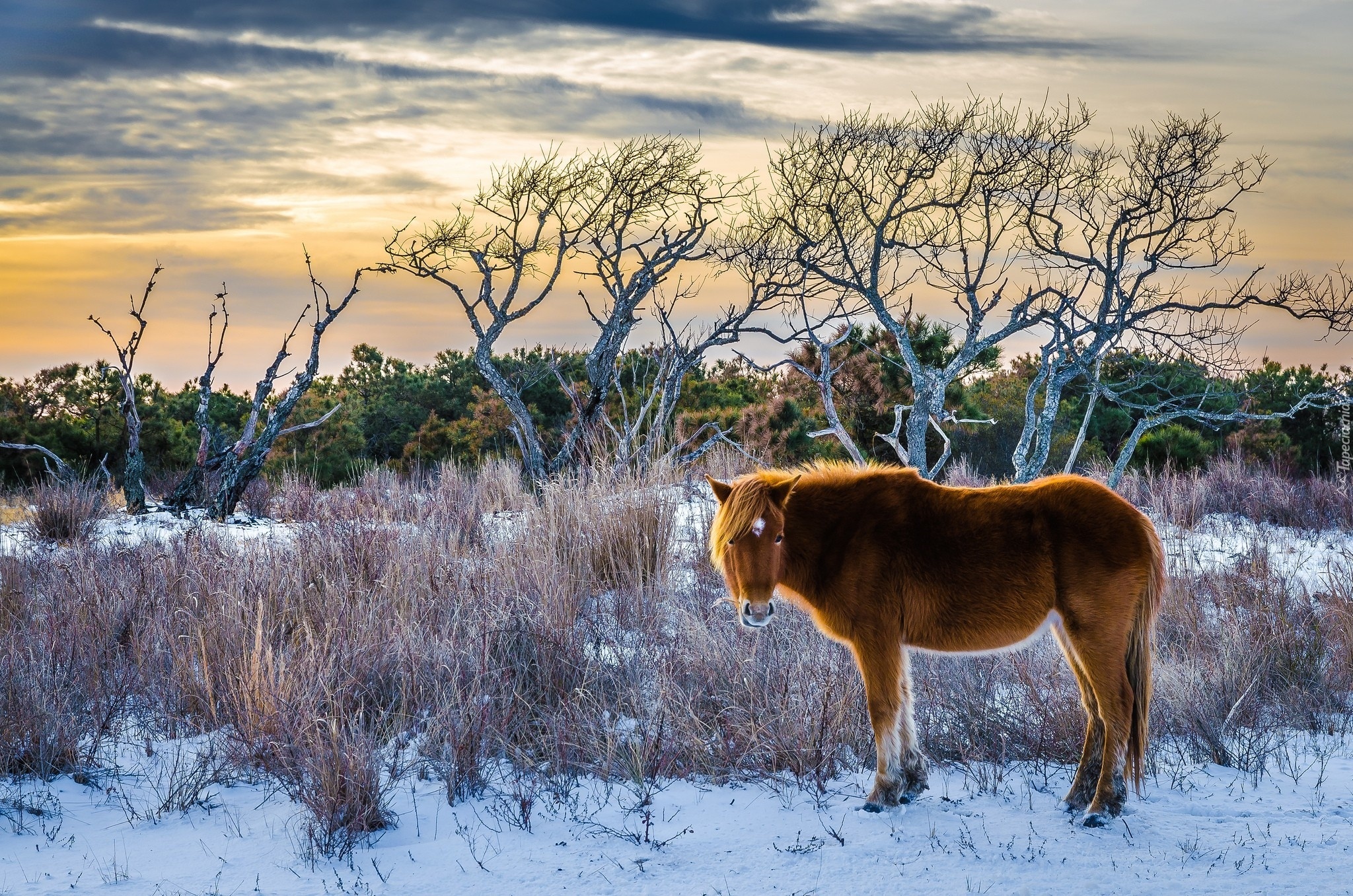 Edytor tapety: Koń, Trawy, Drzewa, Śnieg