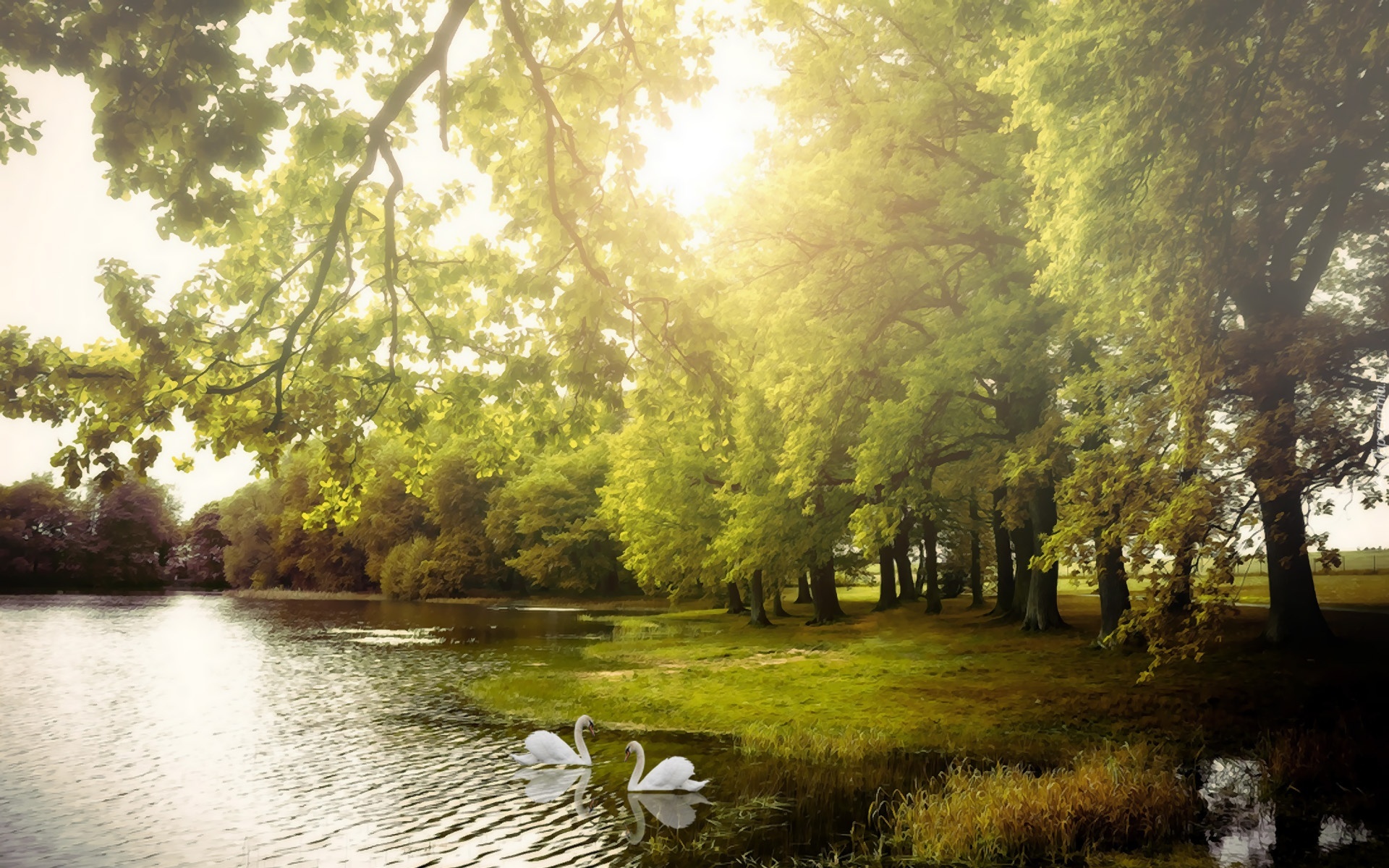 Edytor tapety: Łabędzie, Jezioro, Drzewa