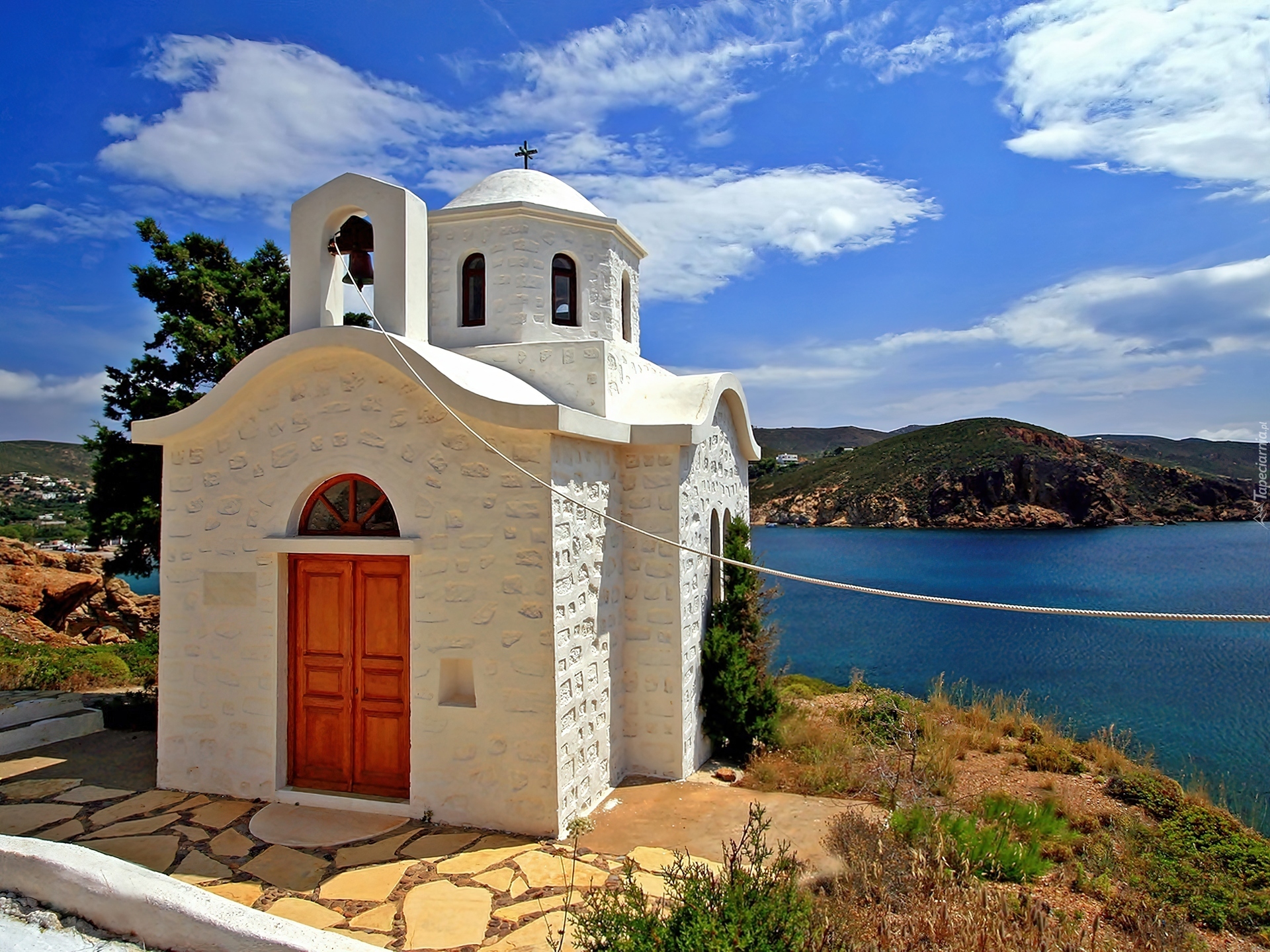 Edytor tapety: Wzgórza, Jezioro, Biały, Kościółek