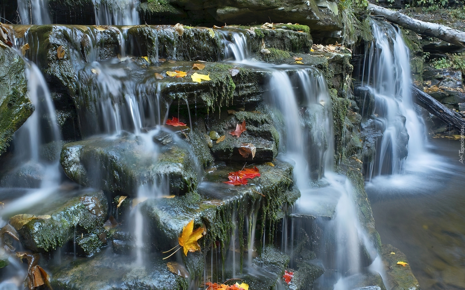 Edytor tapety: Wodospad, Kamienie, Liście