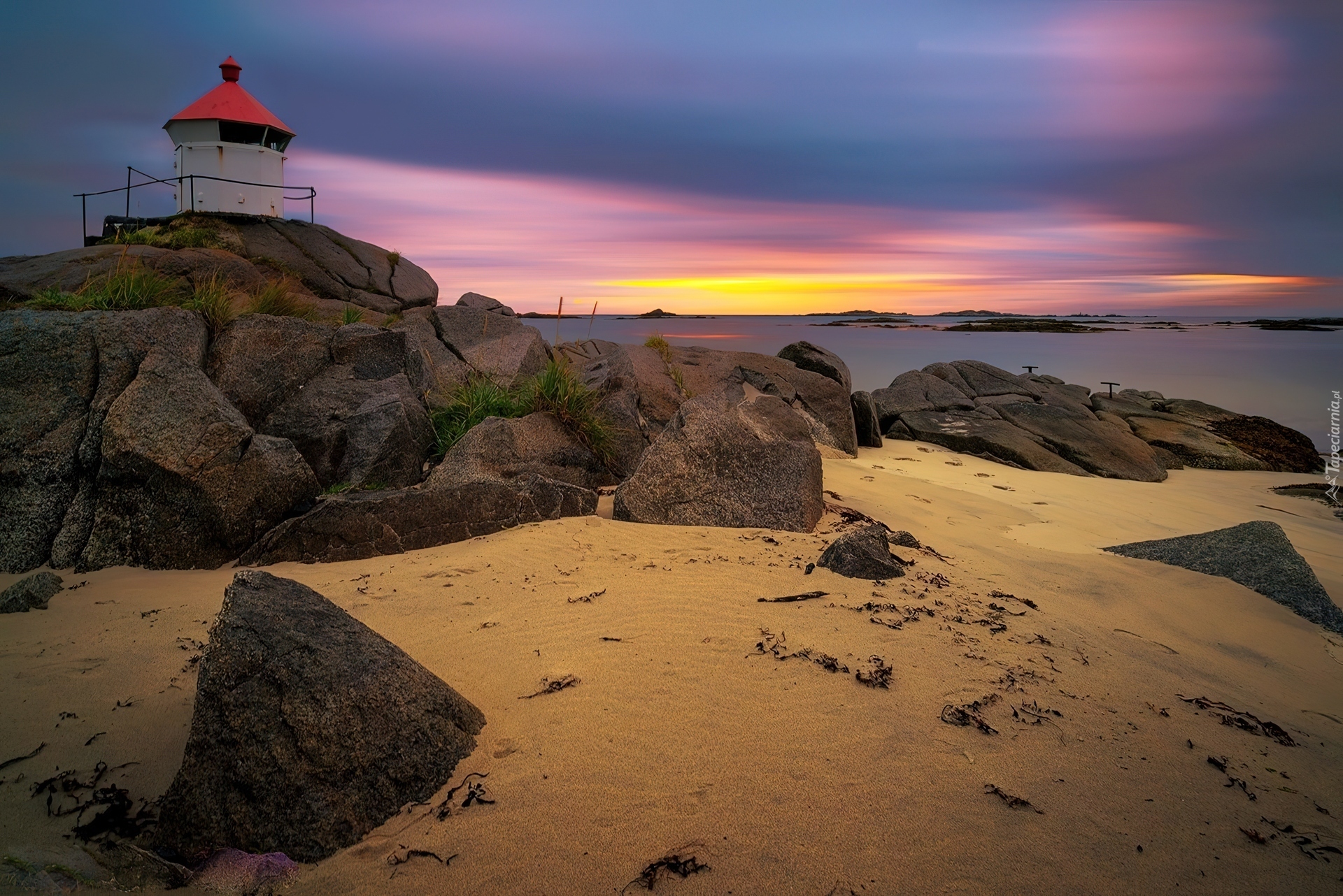 Edytor tapety: Zachód, Słońca, Skały, Latarnia, Morska, Piasek