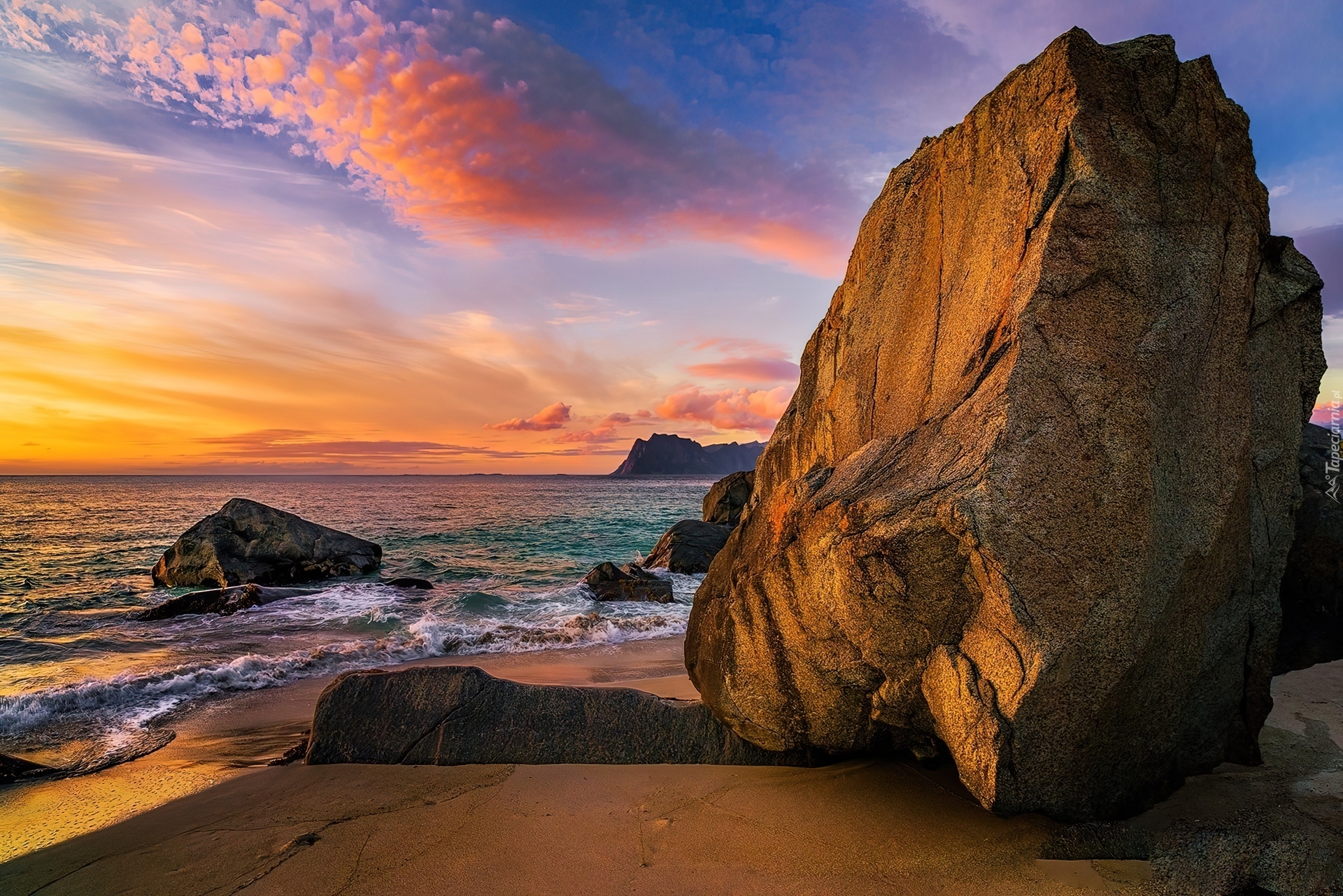 Edytor tapety: Zachód, Słońca, Skała, Morze, Kamienie