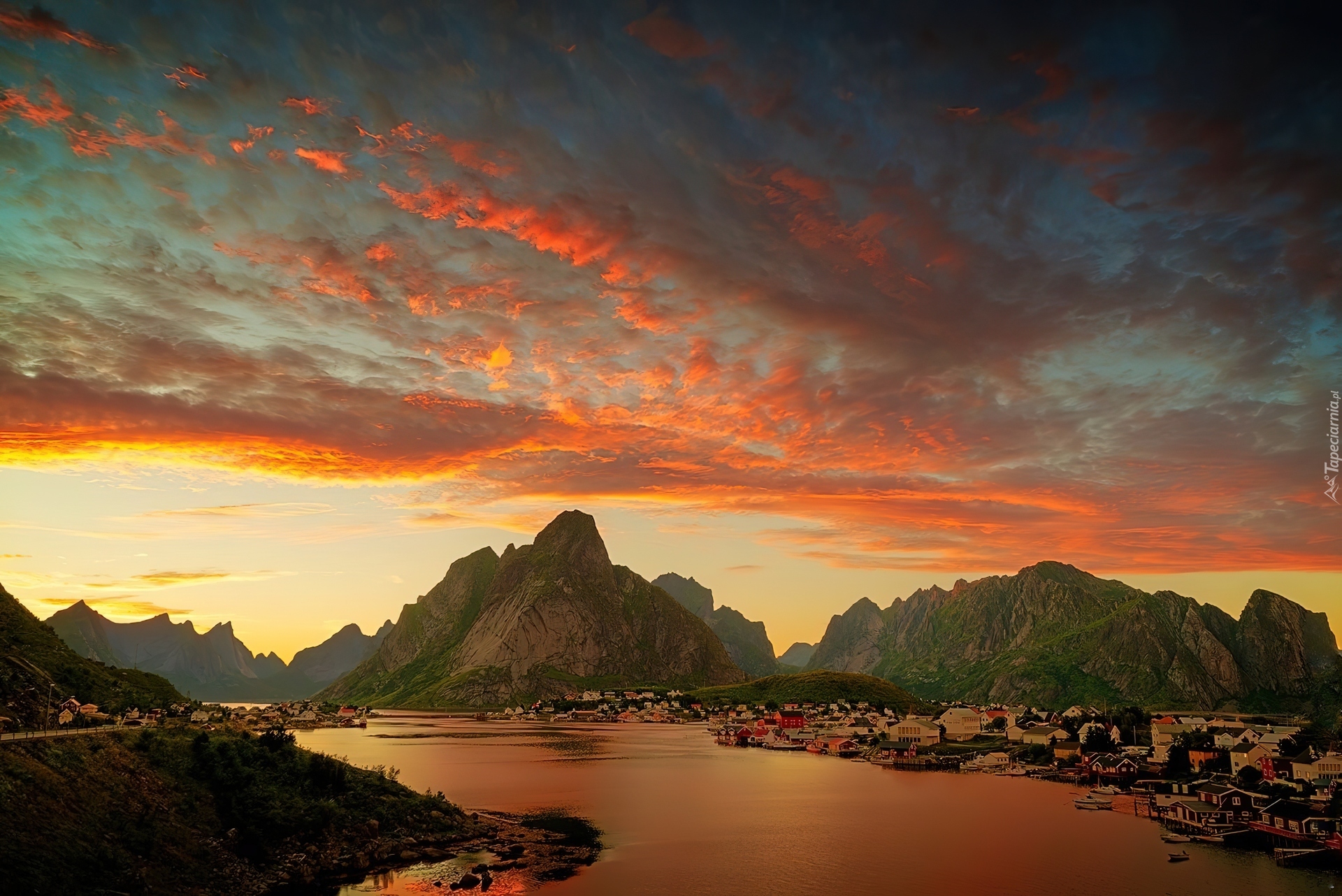 Edytor tapety: Zachód, Słońca, Chmury, Góry, Rzeka, Miasteczko