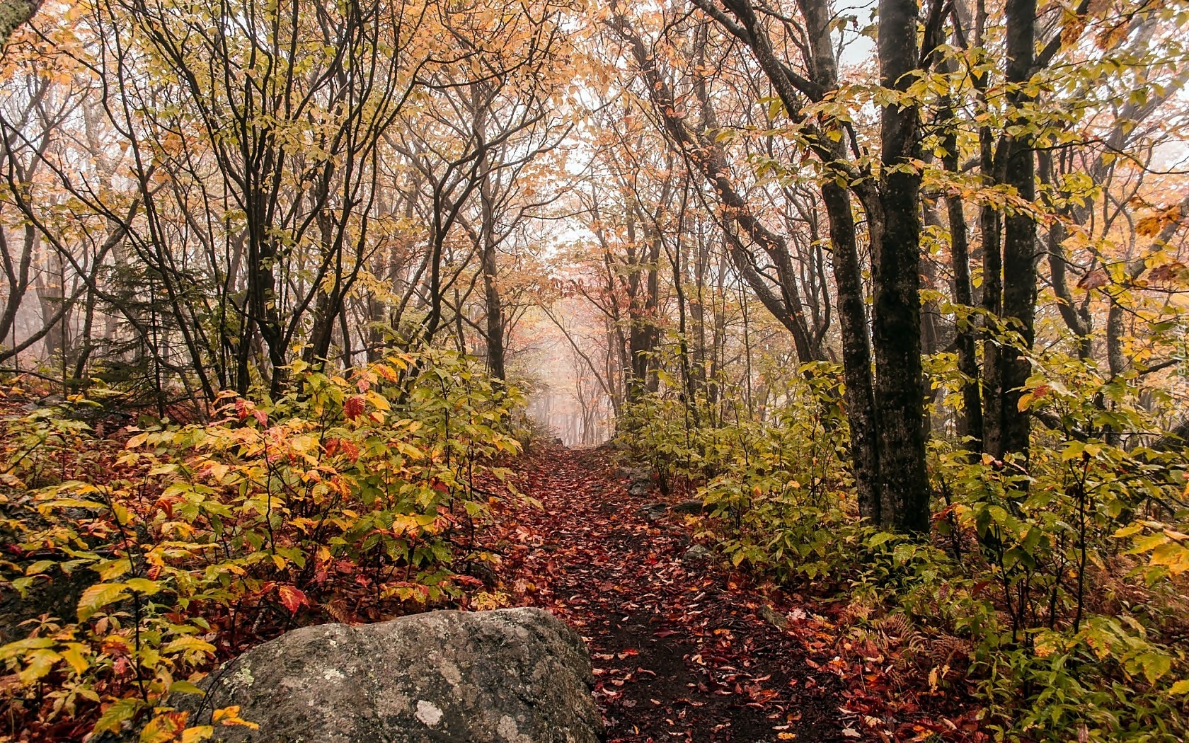 Edytor tapety: Jesienny, Las, Droga, Głaz, Mgła