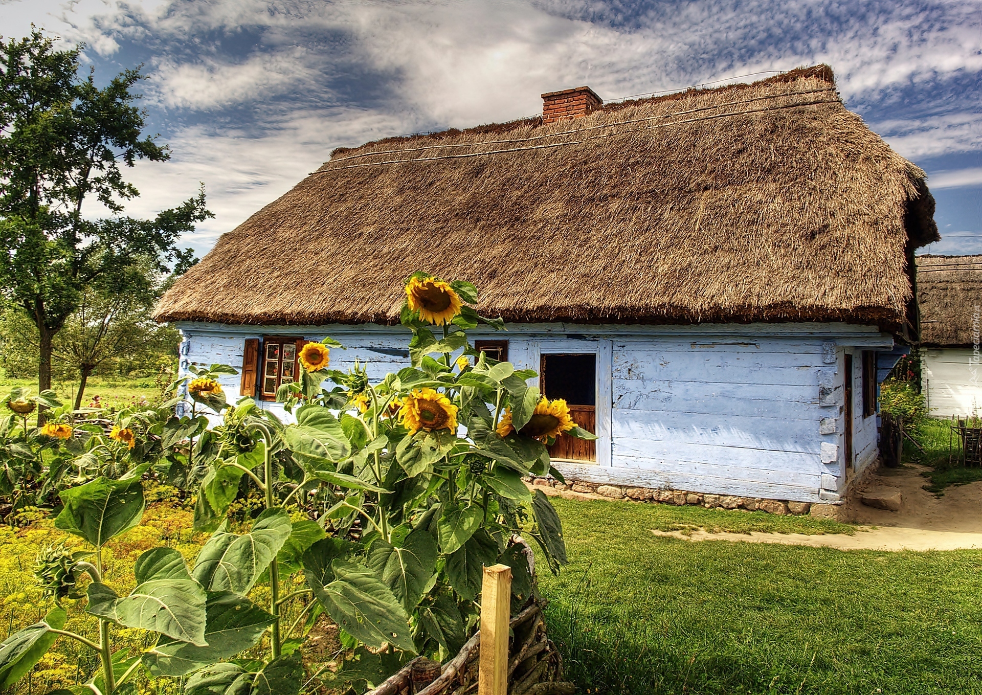 Edytor tapety: Sierpc, Skansen, Chałupa, Ogródek, Słoneczniki