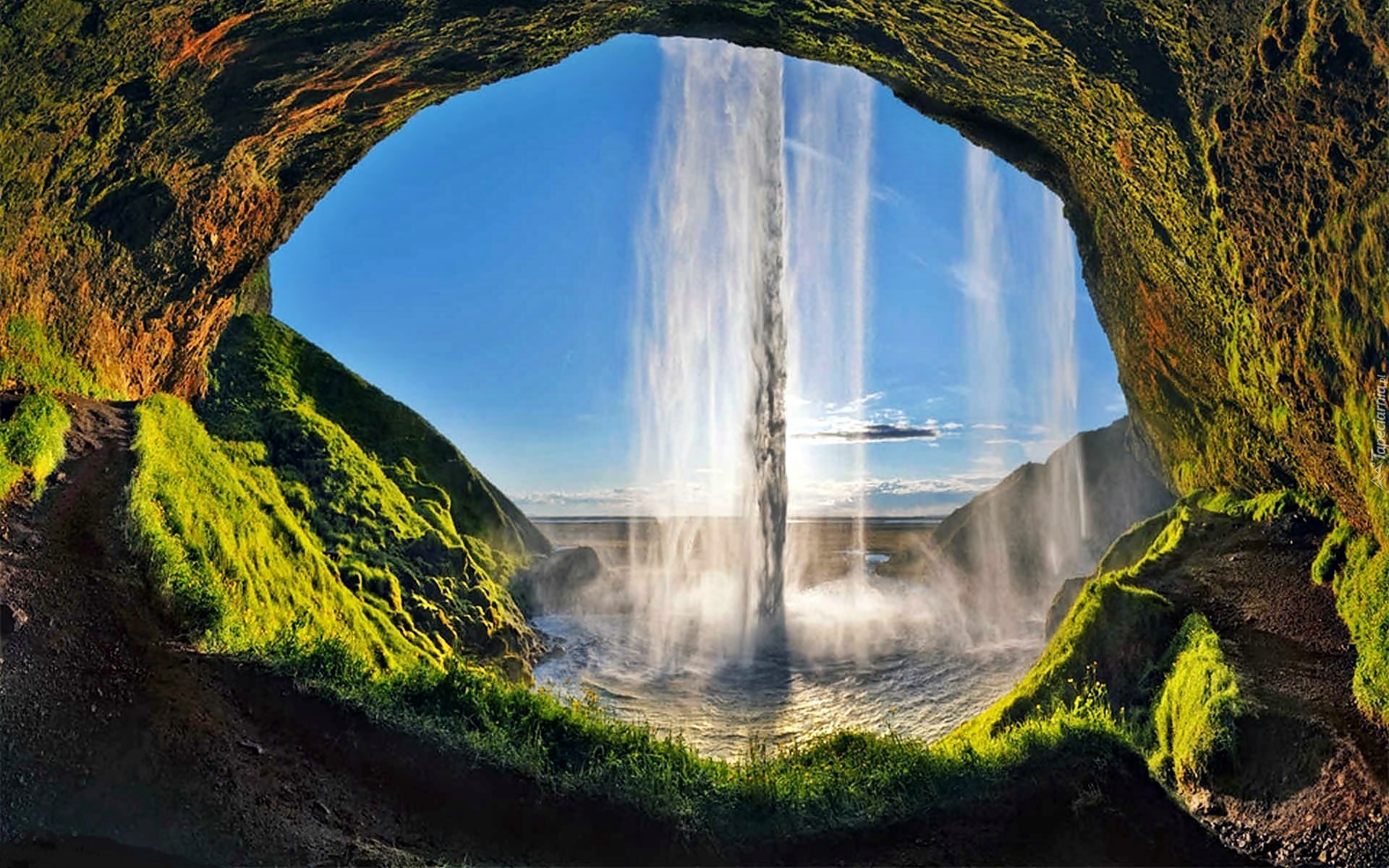 Edytor tapety: Wodospad, Seljalandsfoss, Skały, Jaskinia, Mchy, Światło, Cień