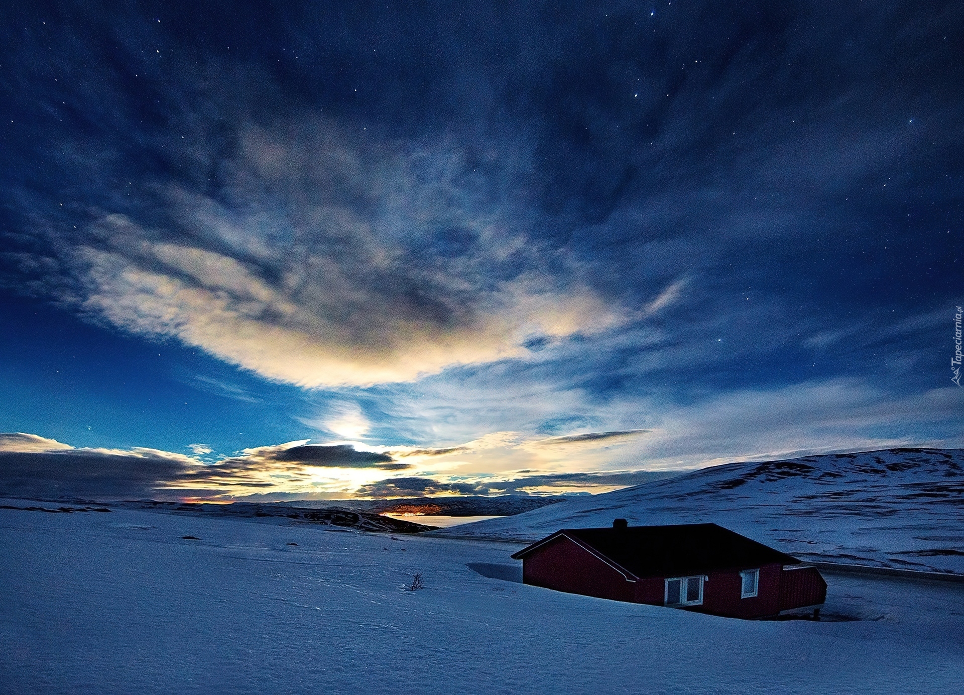 Edytor tapety: Zachód, Słońca, Chmury, Domek