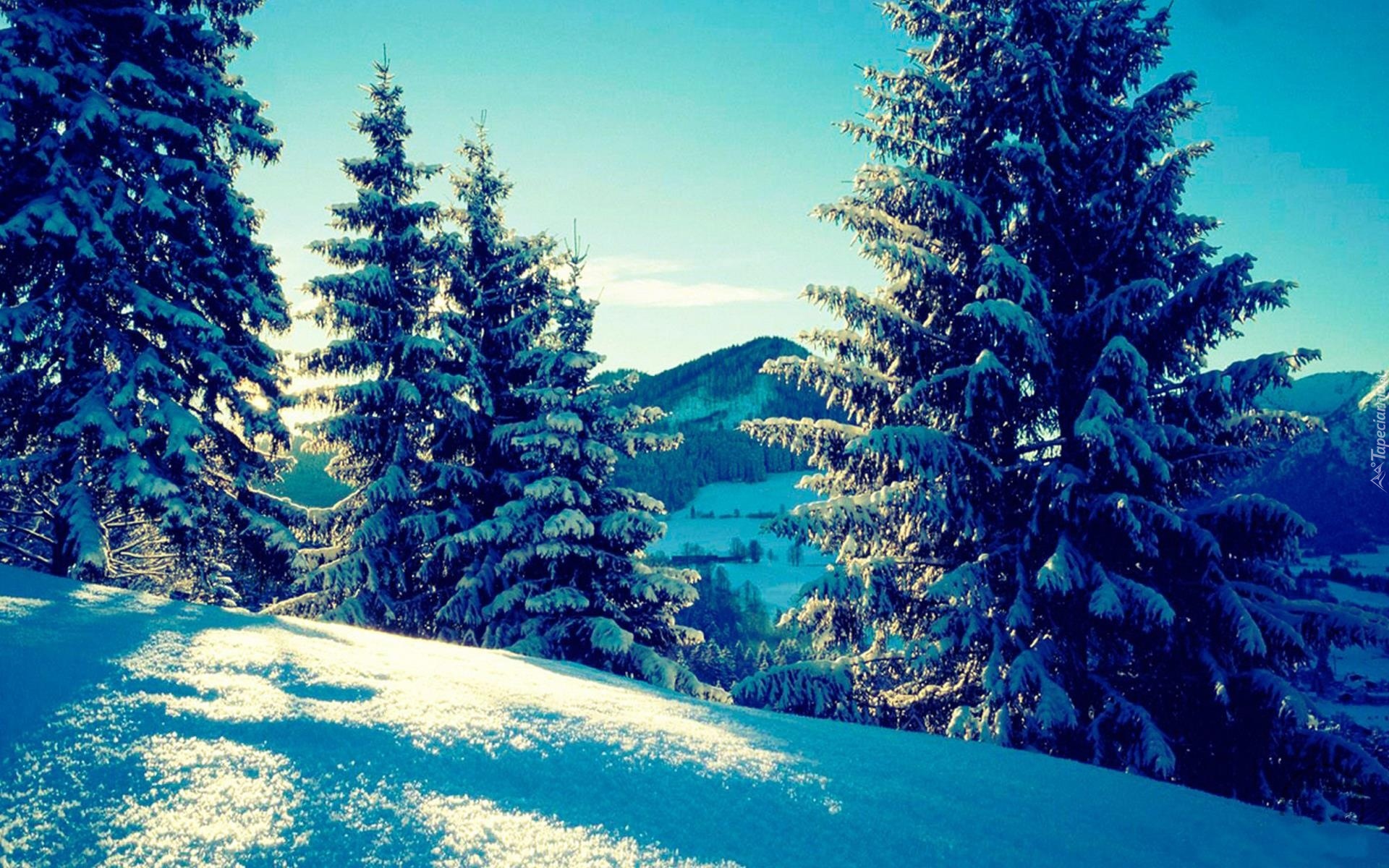 Edytor tapety: Góry, Lasy, Drzewa, Przebijające, Światło, Zima