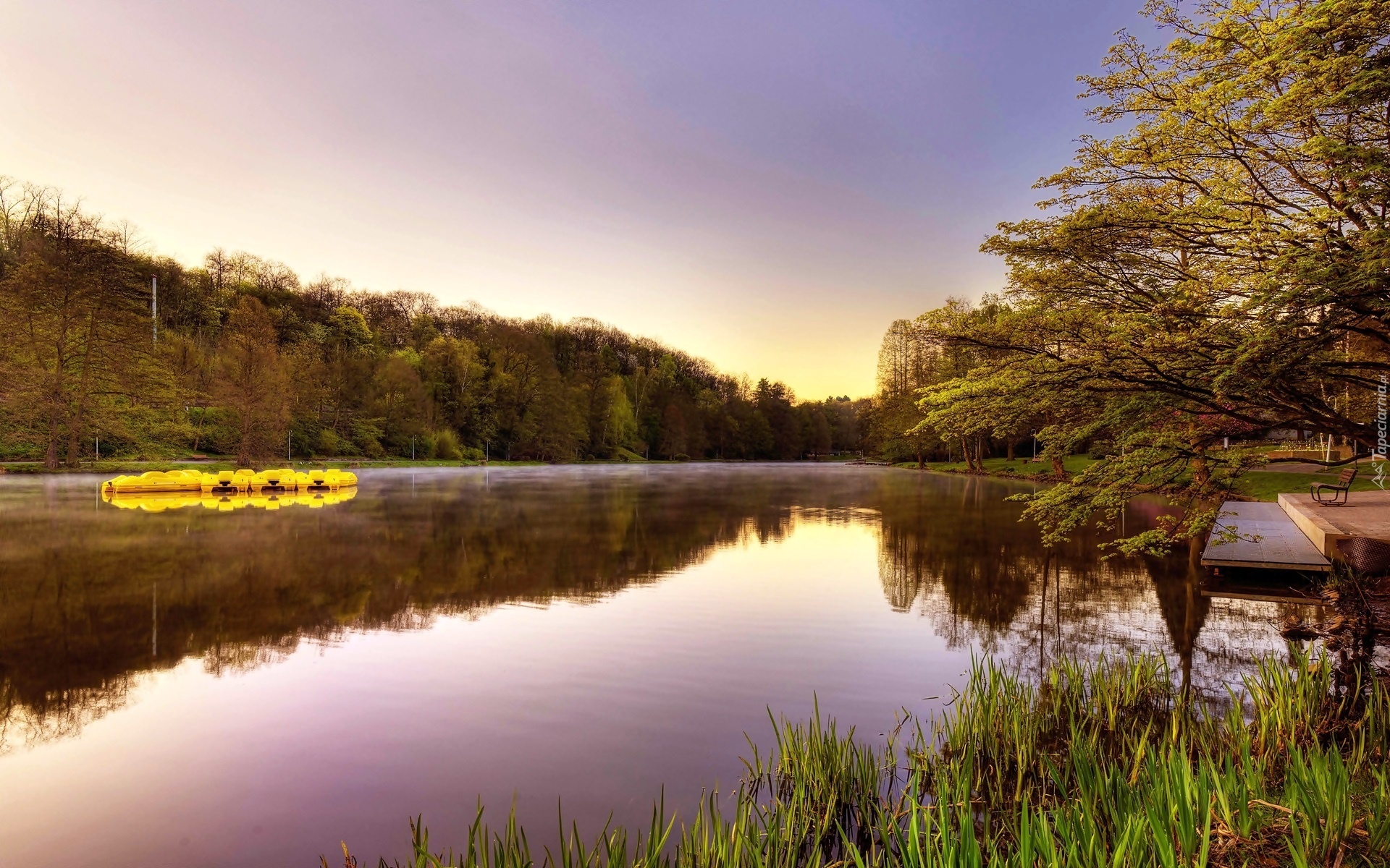 Edytor tapety: Park, Jezioro, Pomost, Ławeczka, Wschód, Słońca