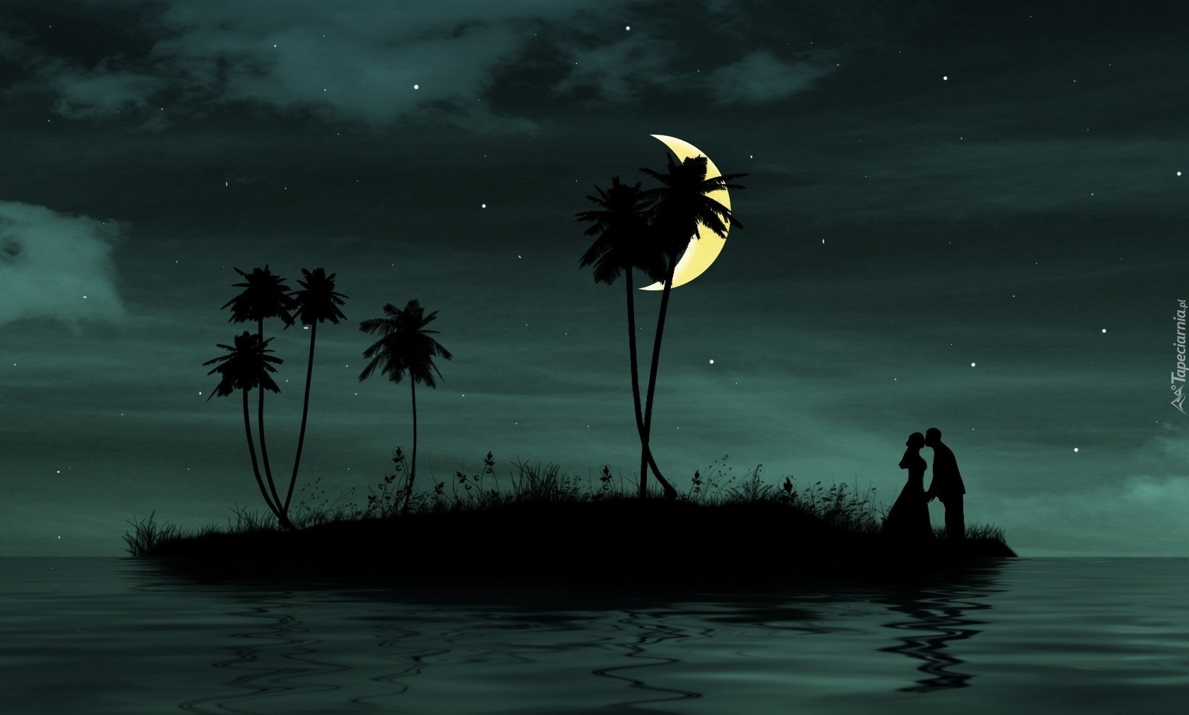 Edytor tapety: Noc, Zakochana, Para, Księżyc, Palmy, Morze