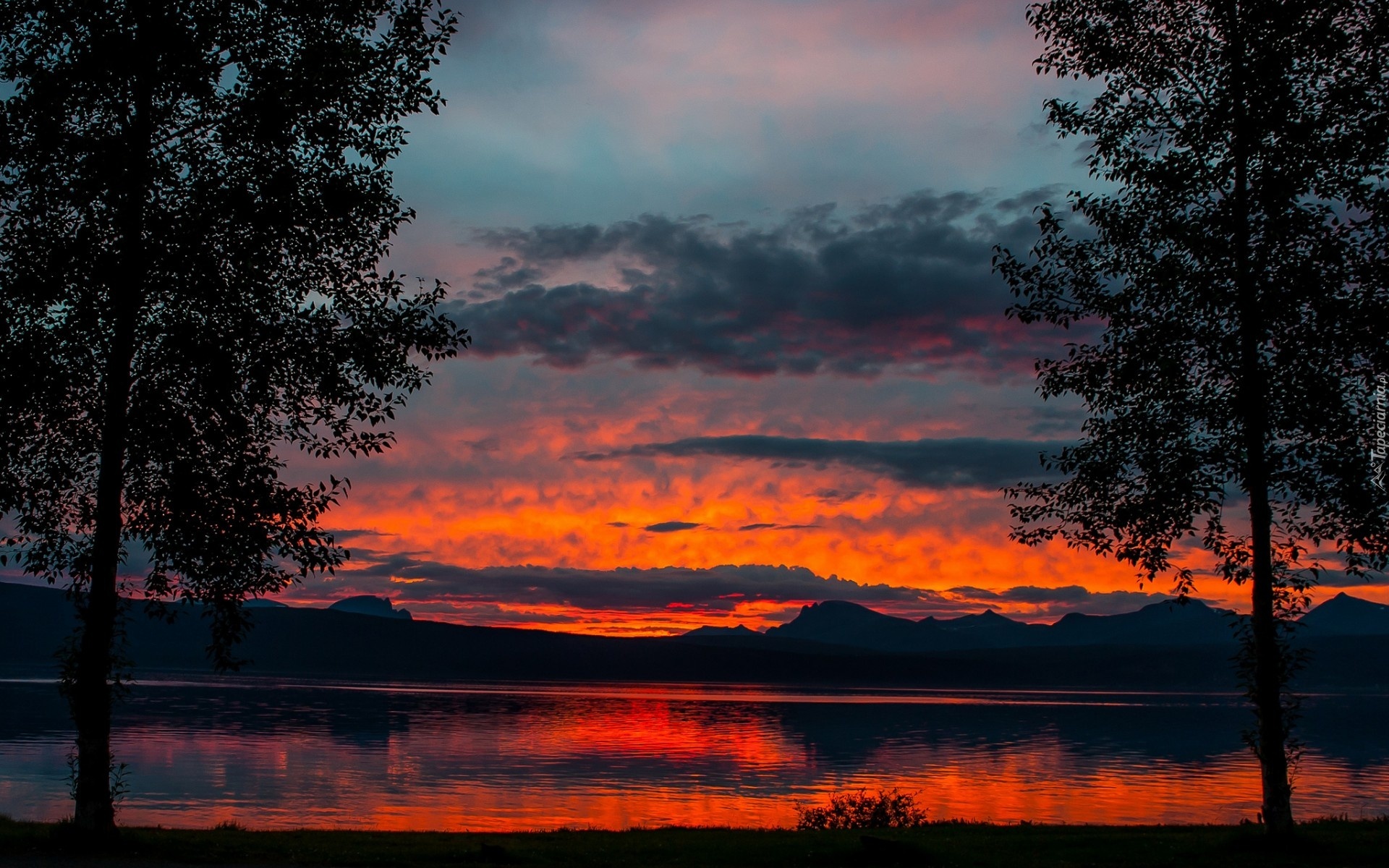 Edytor tapety: Jezioro, Góry, Drzewa, Chmury, Zachód, Słońca